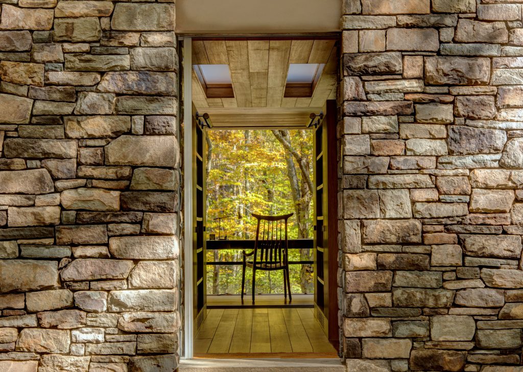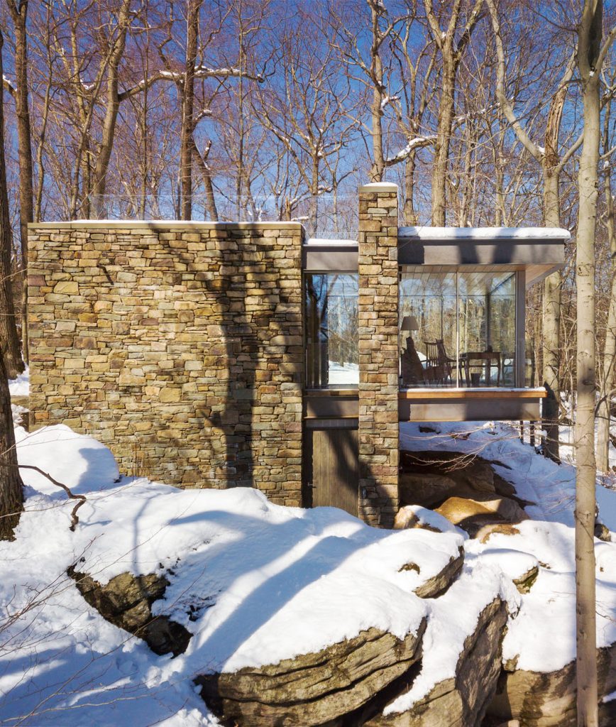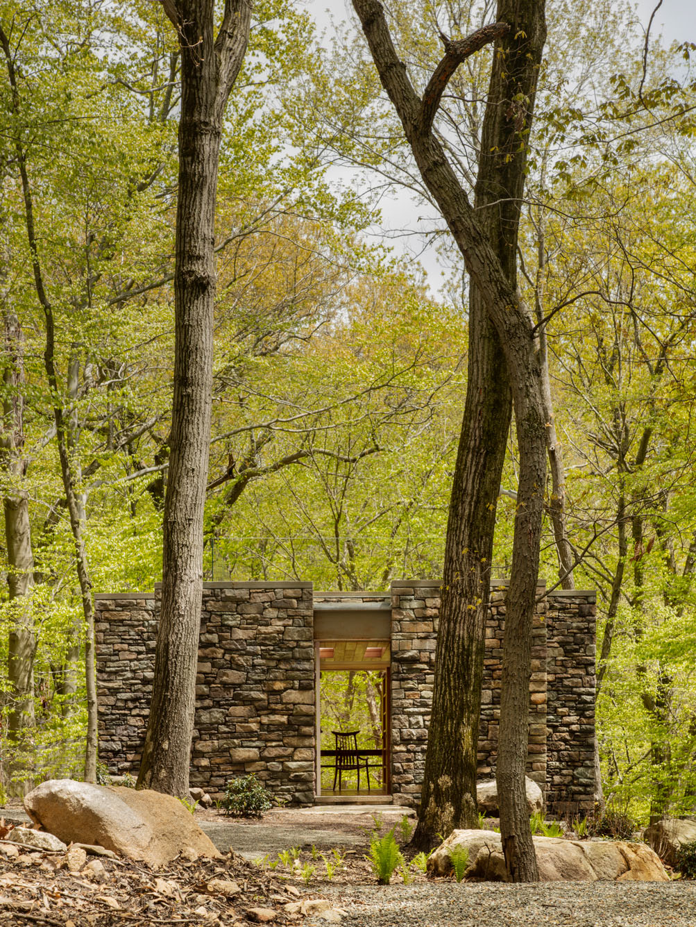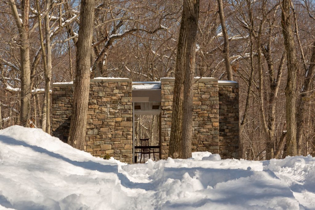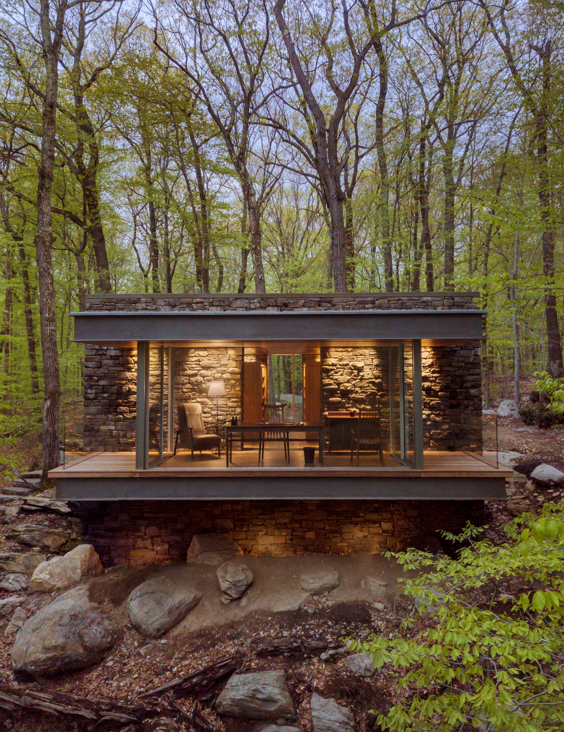Designed to provide an escape from contemporary living, the Greenwich Writer’s Studio is rectangular in plan, and the 650-square-foot (60-square-metre) building partly cantilevers over a rocky hillside, which slopes down toward a small ravine. The architect behind the project decided to clad the exterior walls in fieldstone and bluestone with the objective of integrating and blending the structure with the natural terrain. The irregular, rocky pieces are positioned in such a way so as to evoke a dry-stacked stone wall – a feature which can be seen throughout historic New England.
