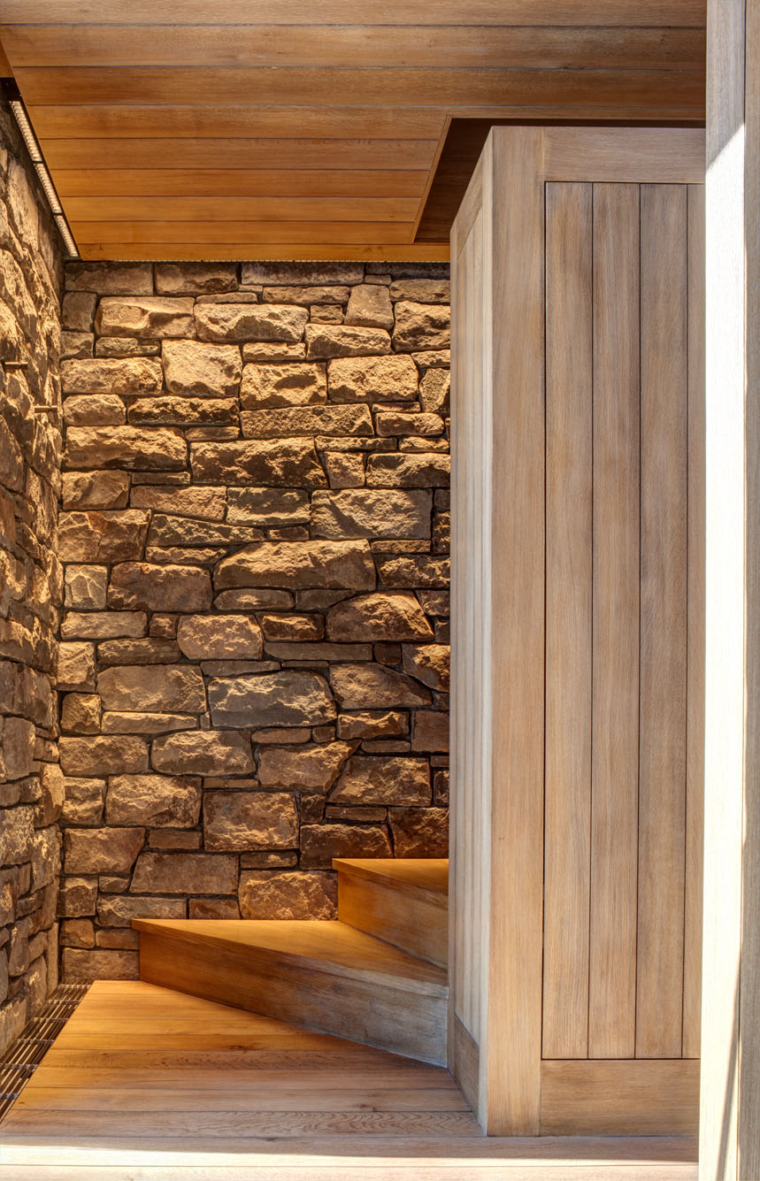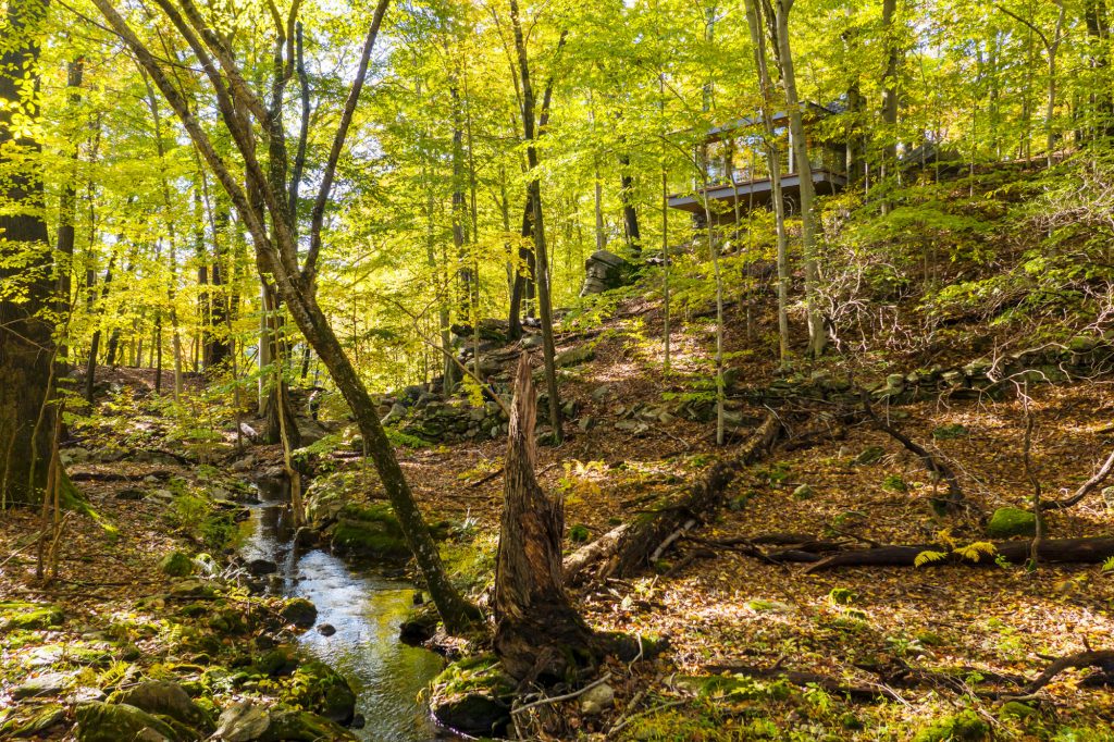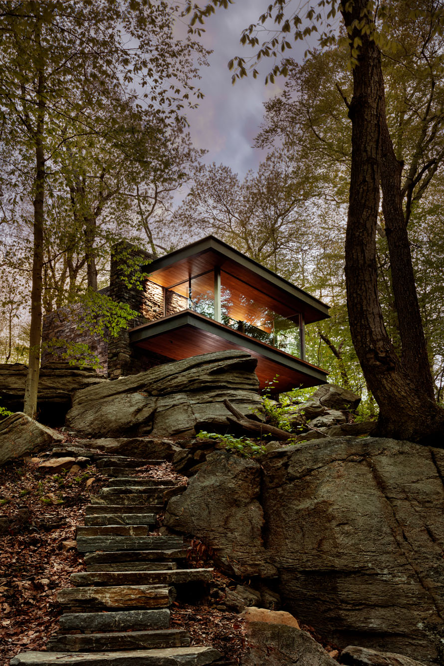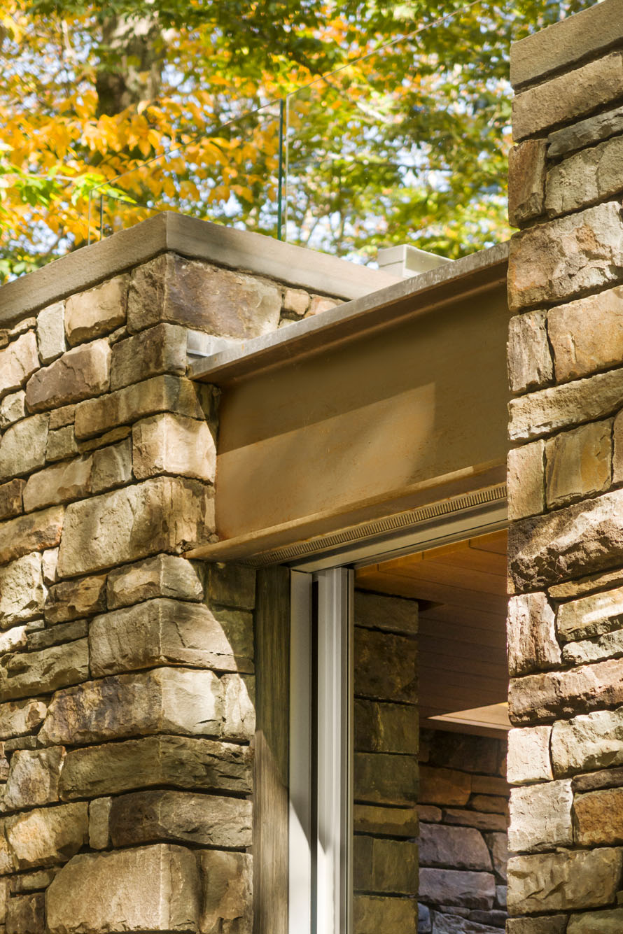 Designed to provide an escape from contemporary living, the Greenwich Writer’s Studio is rectangular in plan, and the 650-square-foot (60-square-metre) building partly cantilevers over a rocky hillside, which slopes down toward a small ravine. The architect behind the project decided to clad the exterior walls in fieldstone and bluestone with the objective of integrating and blending the structure with the natural terrain. The irregular, rocky pieces are positioned in such a way so as to evoke a dry-stacked stone wall – a feature which can be seen throughout historic New England.