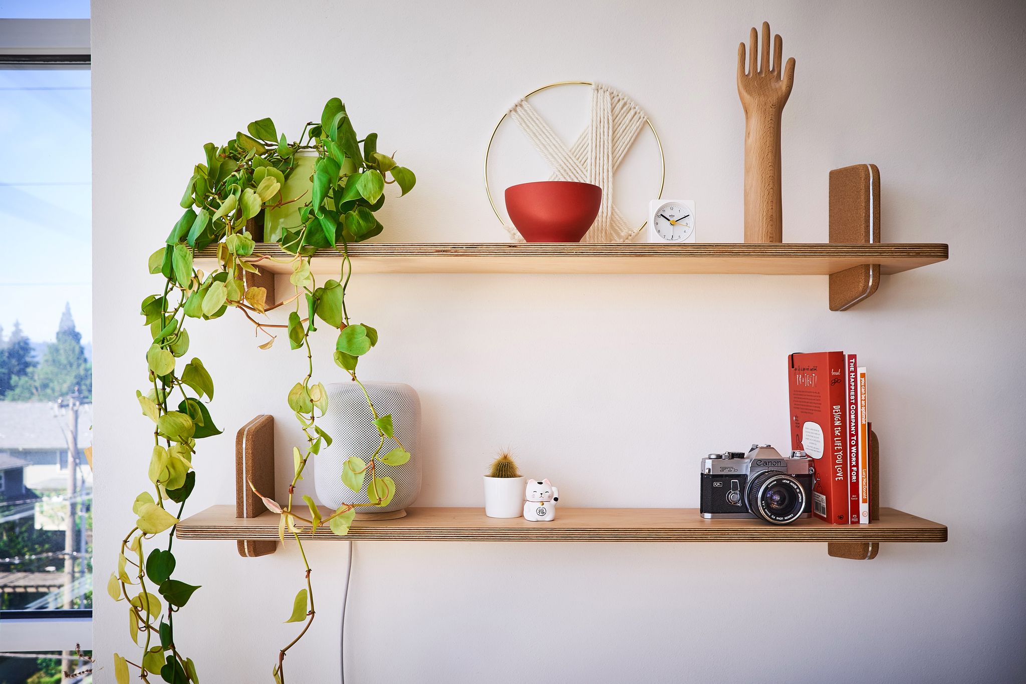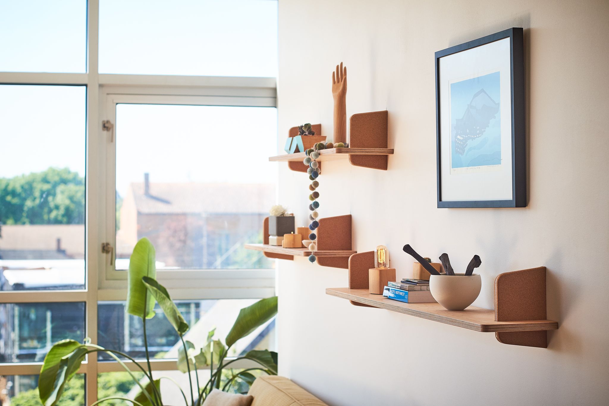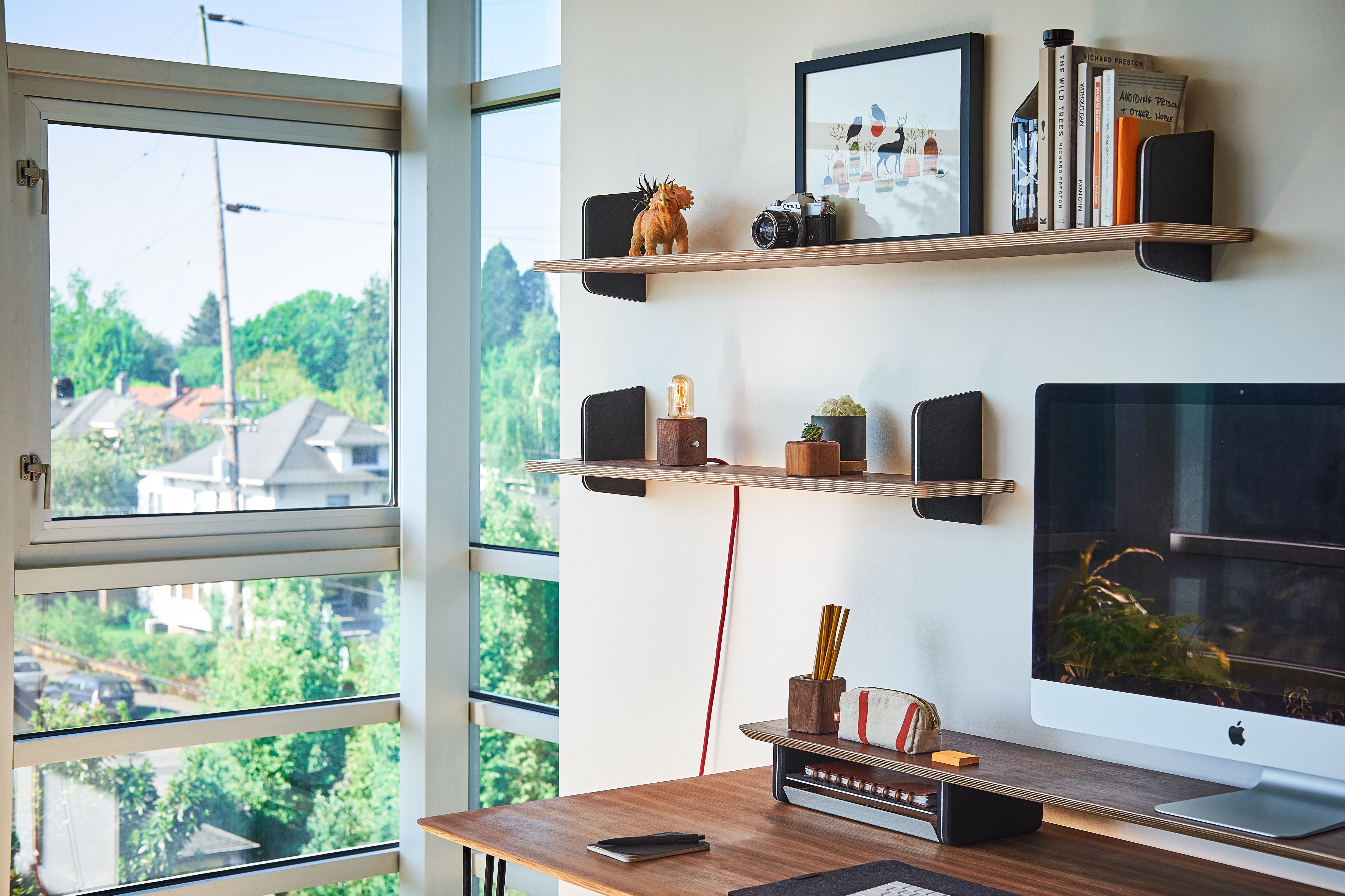 Grovemade wanted the shelf and bracket to magically intersect, without compromising on the strength of the hold. A typical lap joint would have substantially weakened the bracket—instead, they precision machined a hidden bumpout in the wood shelf that notches into a matching slot in the bracket, to make a super clean and super strong joint that gives the shelves an almost floating visual impact that will turn heads aplenty.