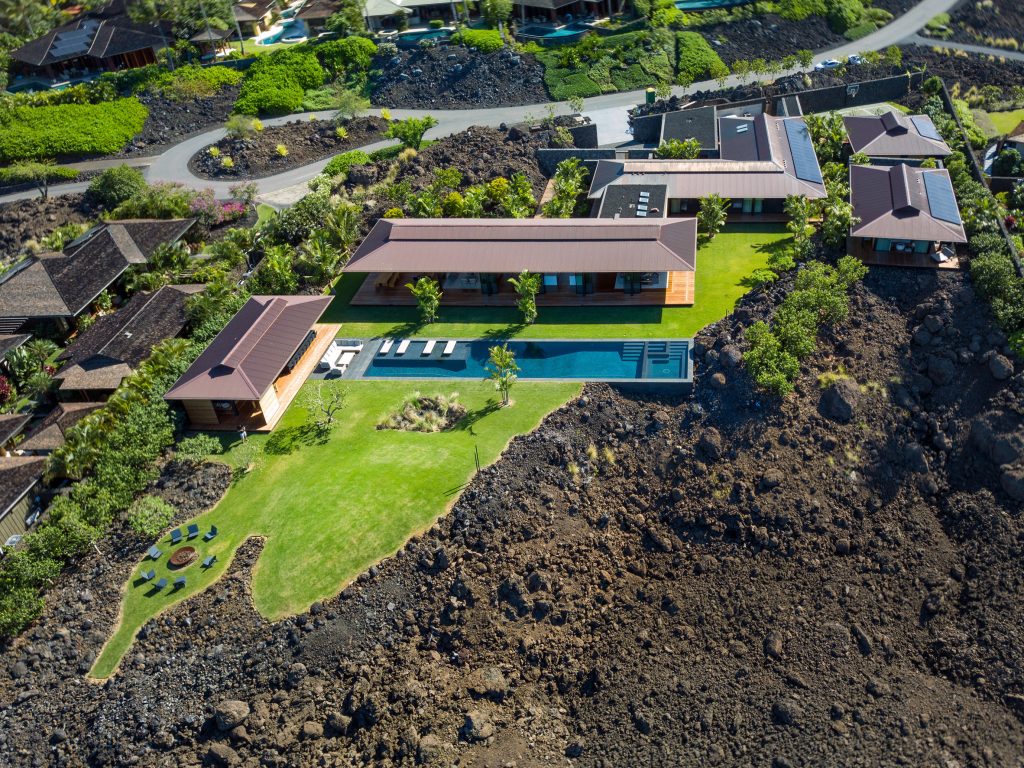 The wonderfully minimalistic Hale Lana House from Olson Kundig is a 17,200-square-foot (1,598-square-metre) property which has been designed on behalf of a couple who wanted ample space to host large gatherings on Hawaii’s Big Island. Its name translates to “floating home” as each structure is elevated ever s slightly above the lava bed – a plain of flat lava flows. Piles of the red and black rocks are positioned around the verdant property and form a cascading hill at its edge.