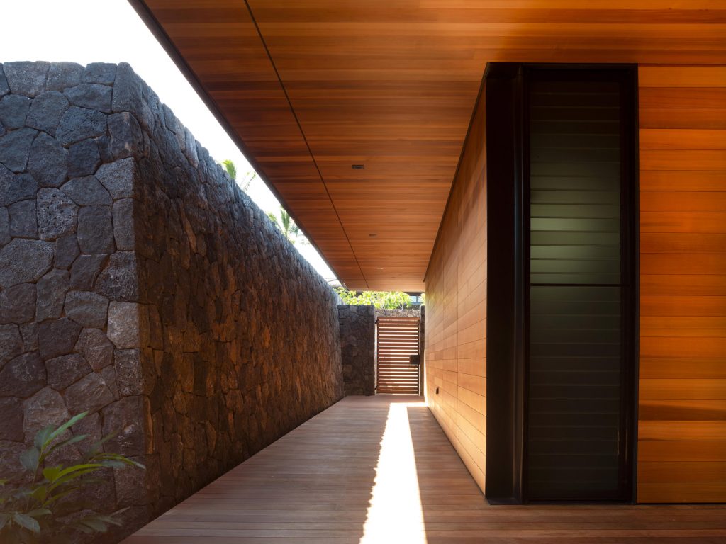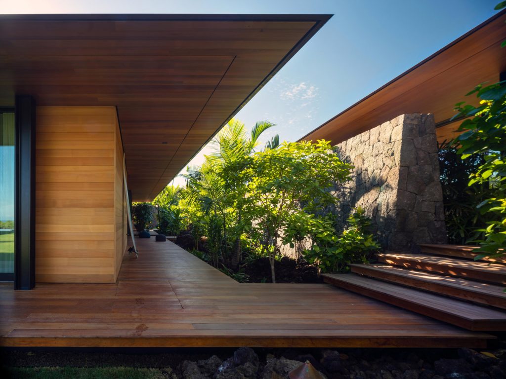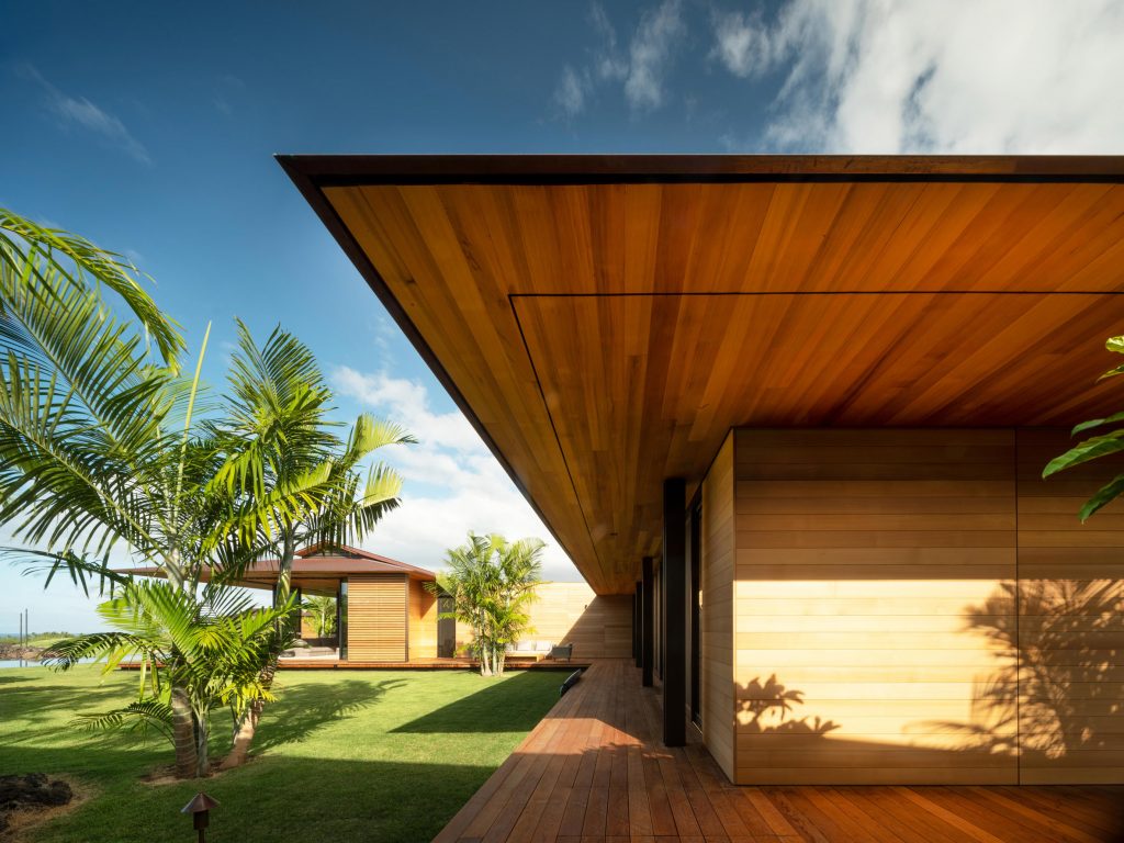 Hale Lana’s roof is heavily influenced by the local Hawaiian vernacular, where large canopy roofs gather prevailing trade wind breezes and keep them moving through the structure. With Hale Lana House, however, the architects take that idea to a new level structurally with an expansive cantilever and an very precise leading roof edge. Each one of the five wood volumes is fronted with sliding glass doors which open onto the covered terraces which are wrapped around the beautiful home.