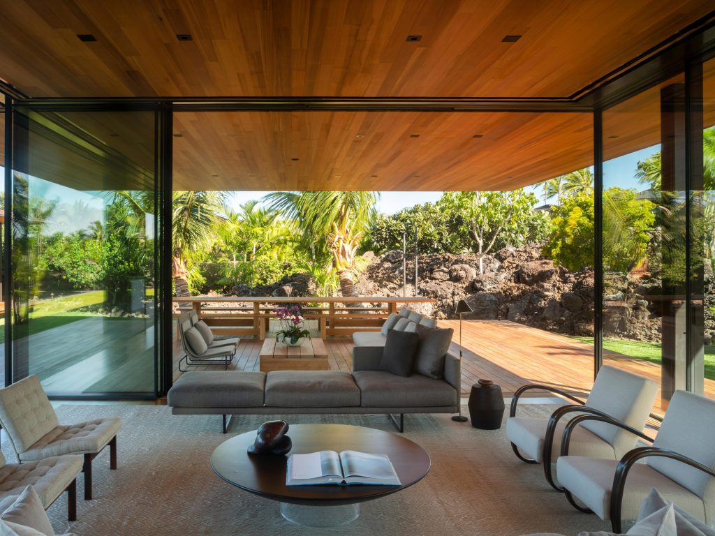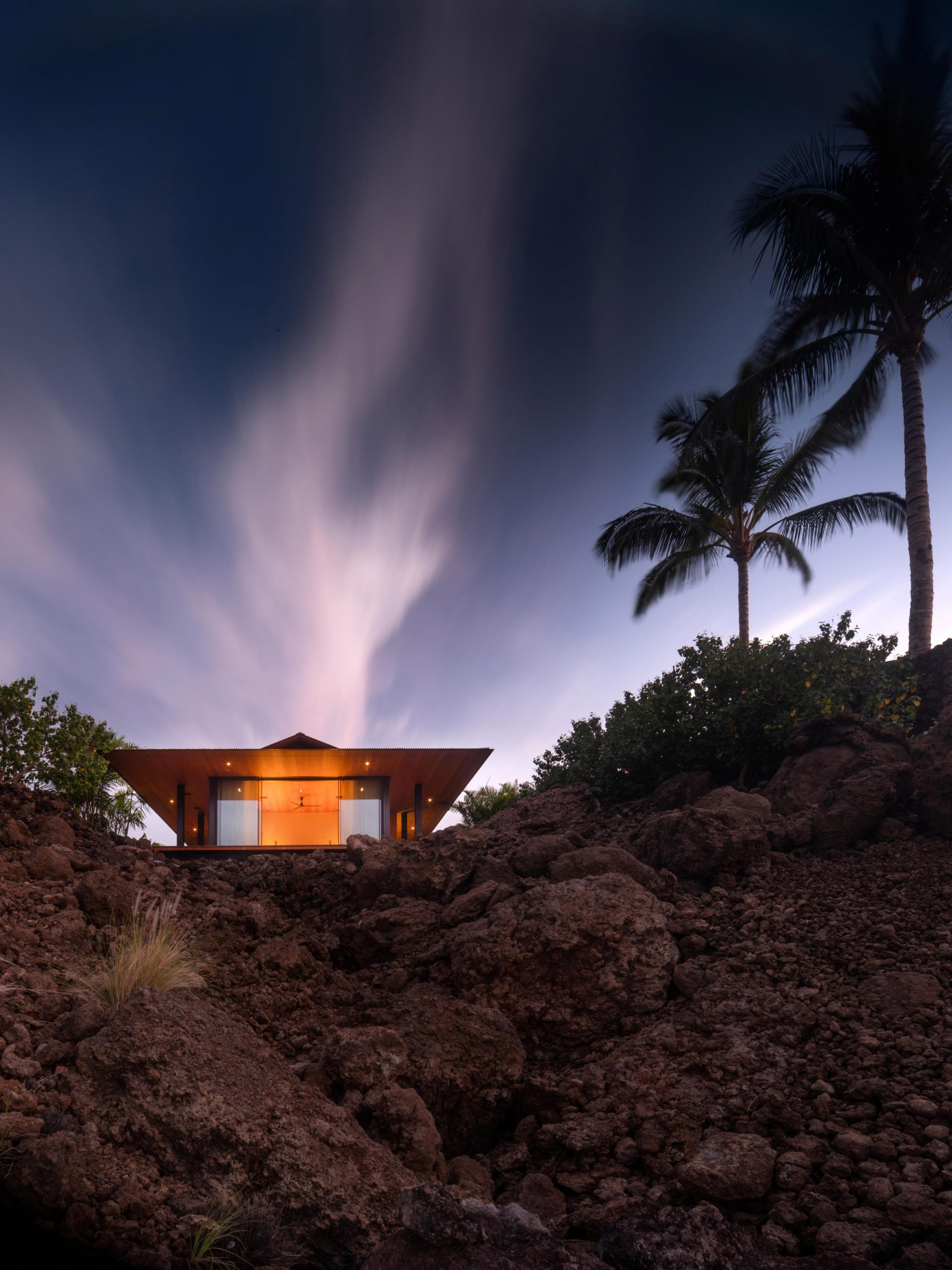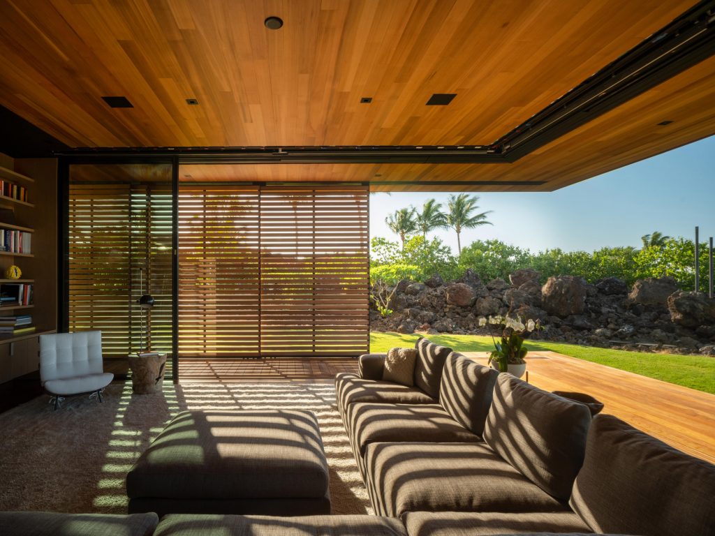 This striking piece of architecture from Olson Kundig boasts a series of adjustable wood shutter screens which are attached to a track installed in each building to allow for control over ever-changing environmental conditions on the Hawaiian island, such as sun exposure and the wind direction.