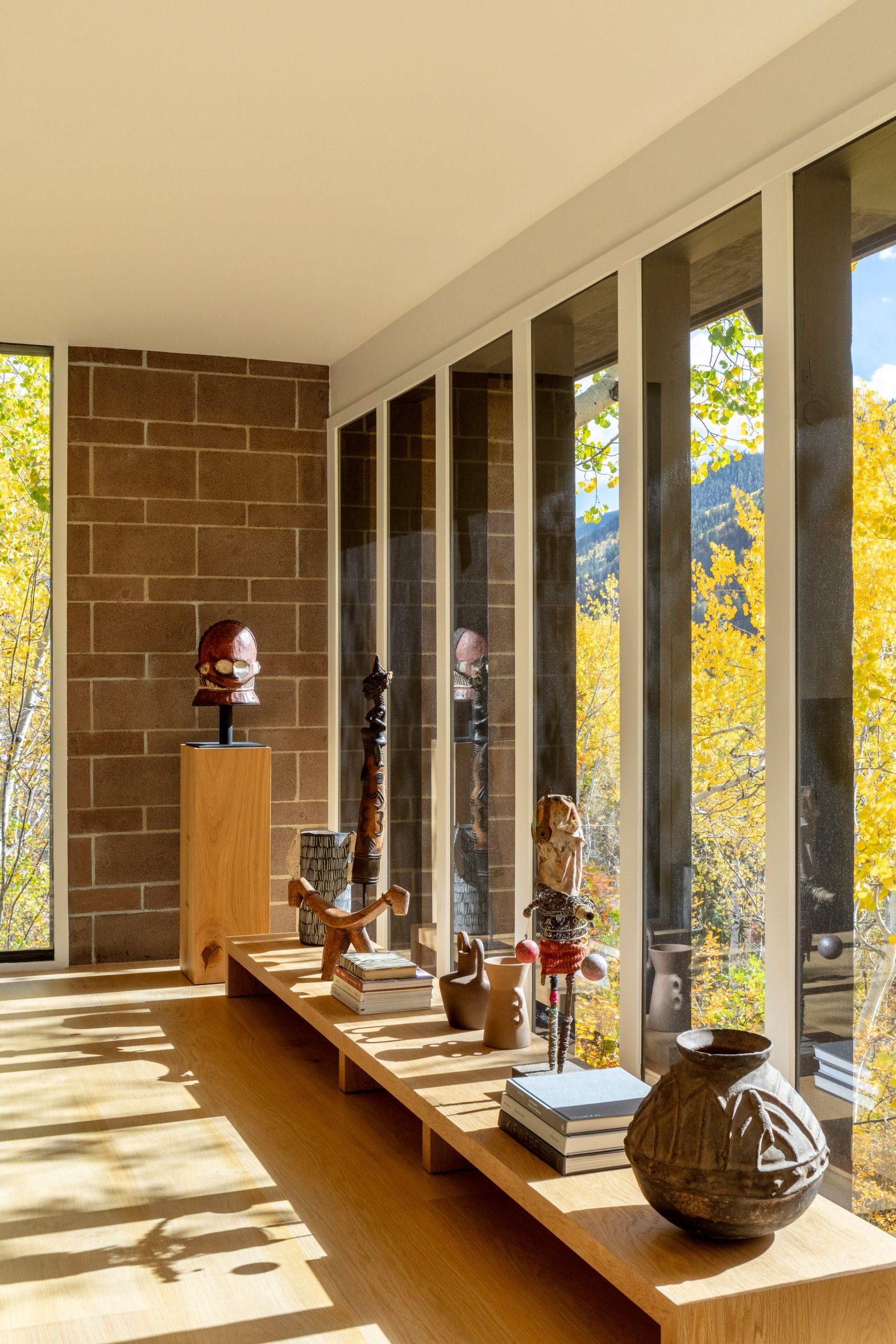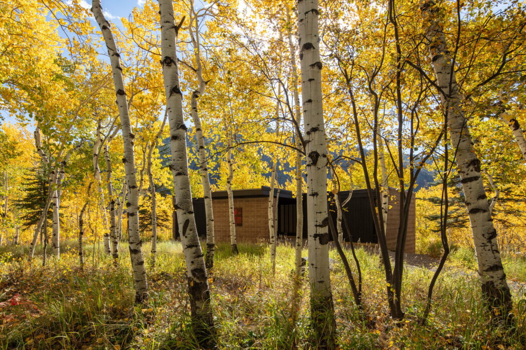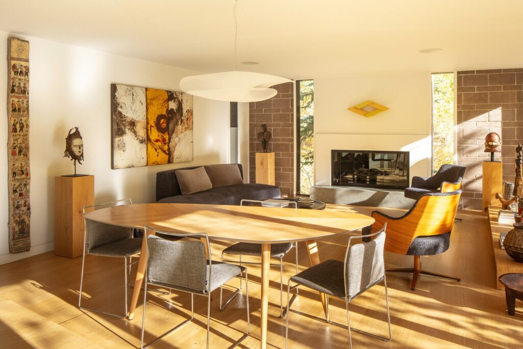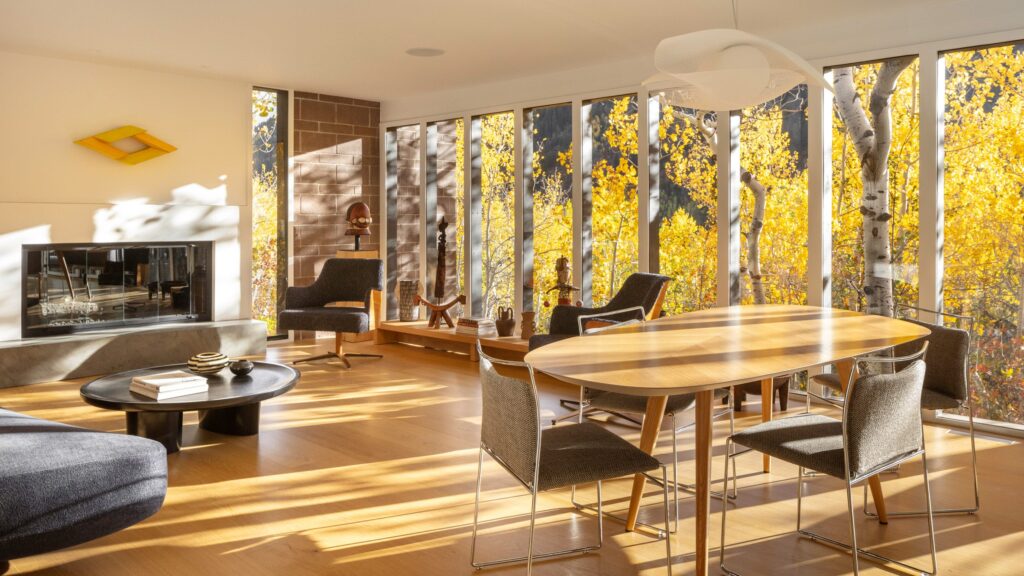 This isn’t just any project; it’s the personal residence of the studio’s founders, Scott Lindenau and Susan Okie Lindenau. Nestled on a high-alpine slope in Aspen and surrounded by a dense grove of its namesake trees, this glorious renovation perfectly balances modern living with 1960s soul, creating a tangible sense of being perched in a magnificent treehouse.