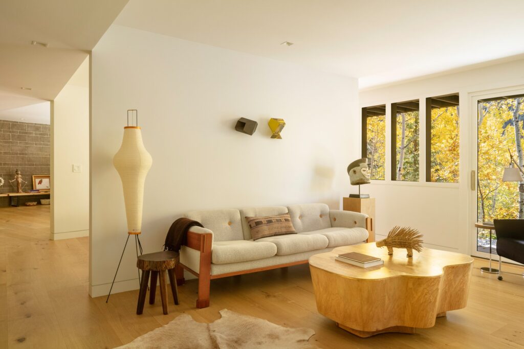 Of course, a house is not a home without the personal touches, and The Perch is a masterclass in curated interior design. Susan Okie Lindenau selected the furnishings, creating a dialogue between iconic design and personal history. Stools and dining chairs from Cassina and a sofa by Vladimir Kagan sit in harmony with a reupholstered family heirloom sofa, originally purchased in Copenhagen in the 1960s.