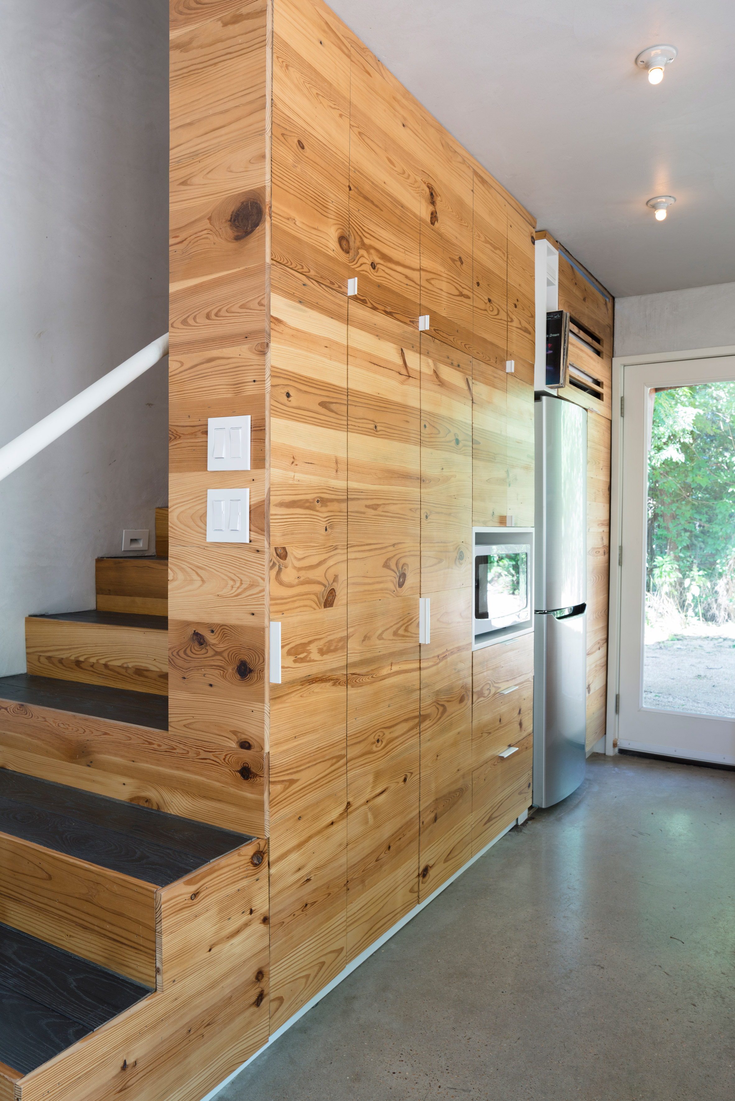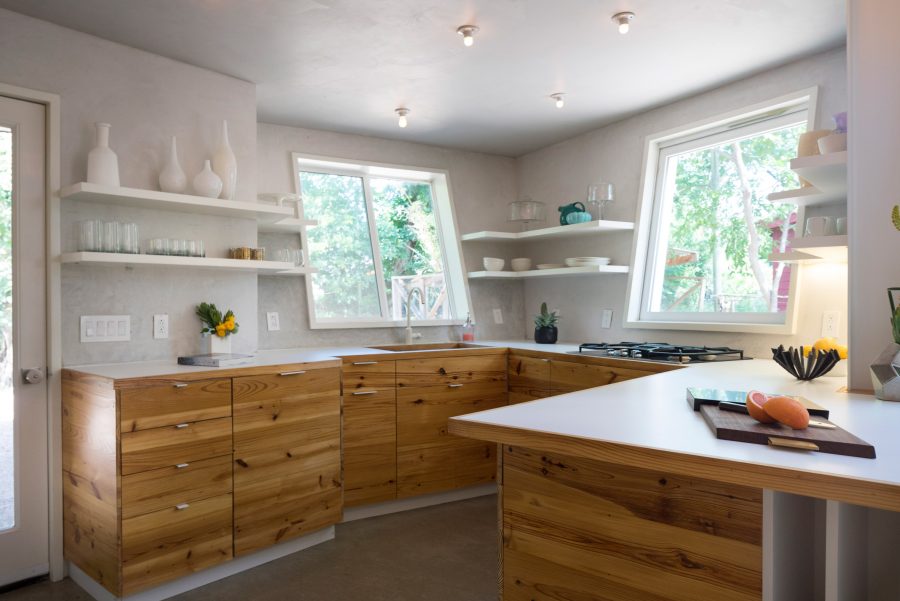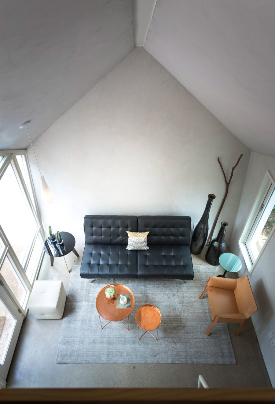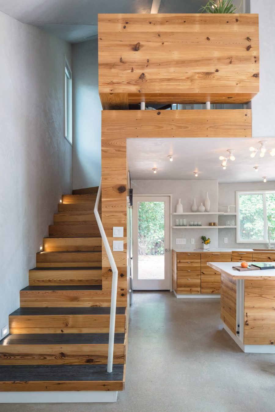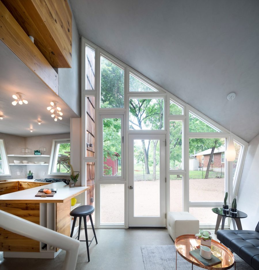 The Hive Guest House in Austin has a highly irregular shape which was conceived as an intriguing response to local design rules – namely, the fact that the city required that the footprint of this guest house be no larger than 320 square feet (30 square metres). To facilitate the creation of a larger dwelling, Studio 512 added a floor and incorporated walls that slant outward and thereby not counting as part of the building’s overall footprint. The Walls tilt from the slab, which hug the building setback planes and an angled utility easement at the rear of the structure, to add volume where needed and given the impression of a beehive.