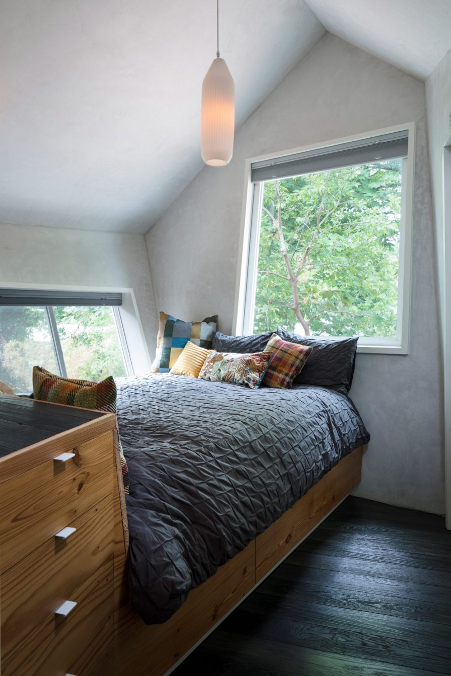 With the exterior walls being clad in large cedar shakes that were crafted using old roofing material, there is an aesthetic appeal to The Hive quite unlike anything else out there. It has differently-sized windows which have been framed in white and bring a pleasing amount of daylight into the compact guest home. The rooms within widen and narrow, depending on how the space is being used and according to Blair, this strategy was influenced by the principles represented in the Vitruvian Man, the famous 15th-century drawing by Leonardo da Vinci.