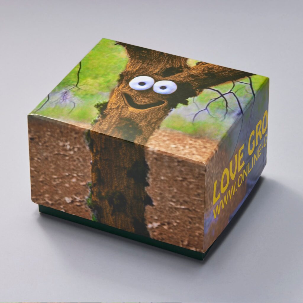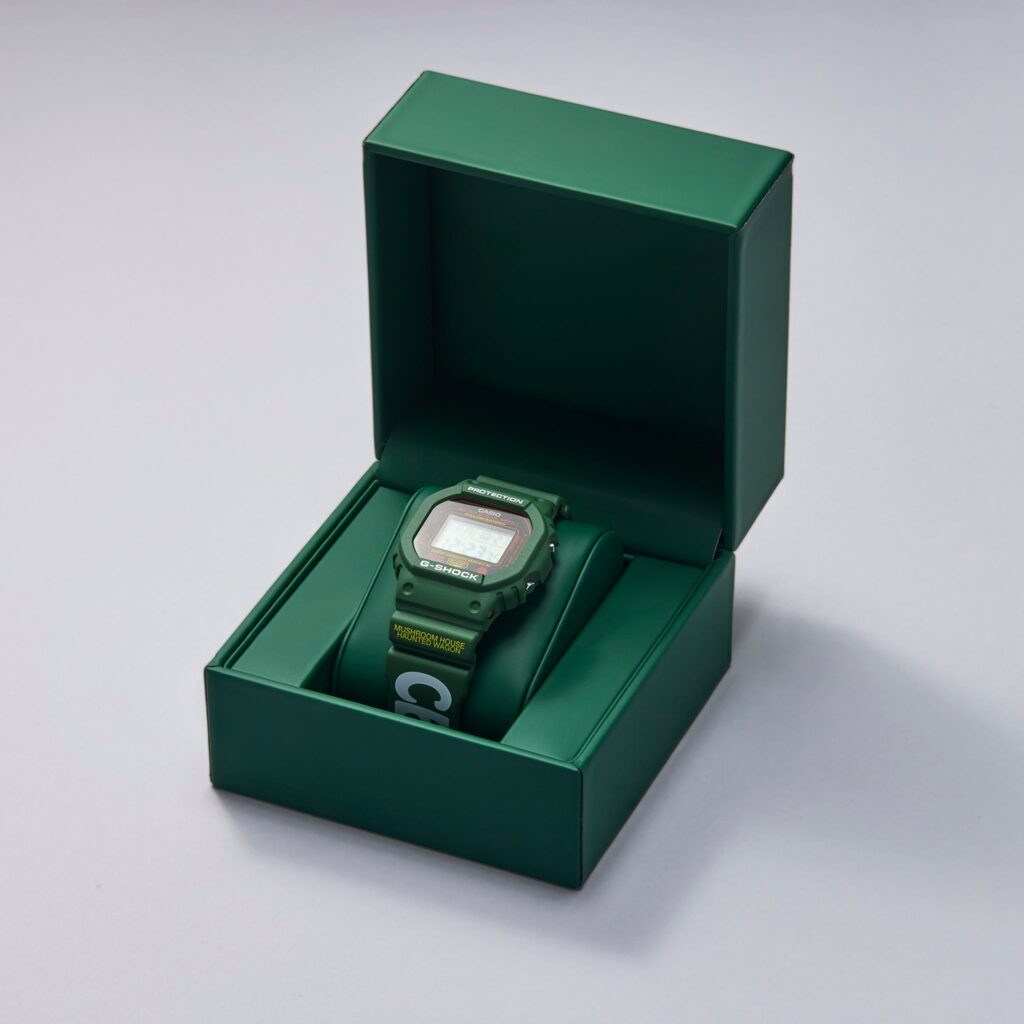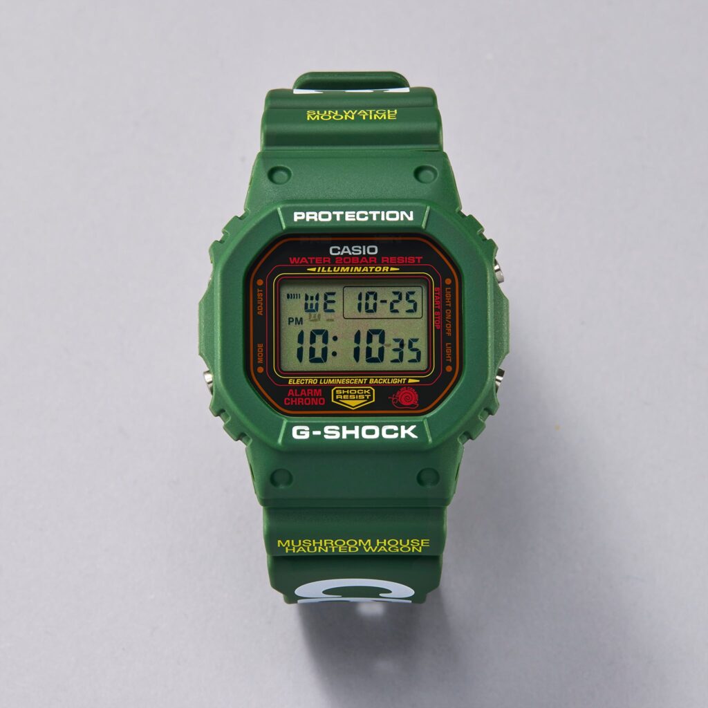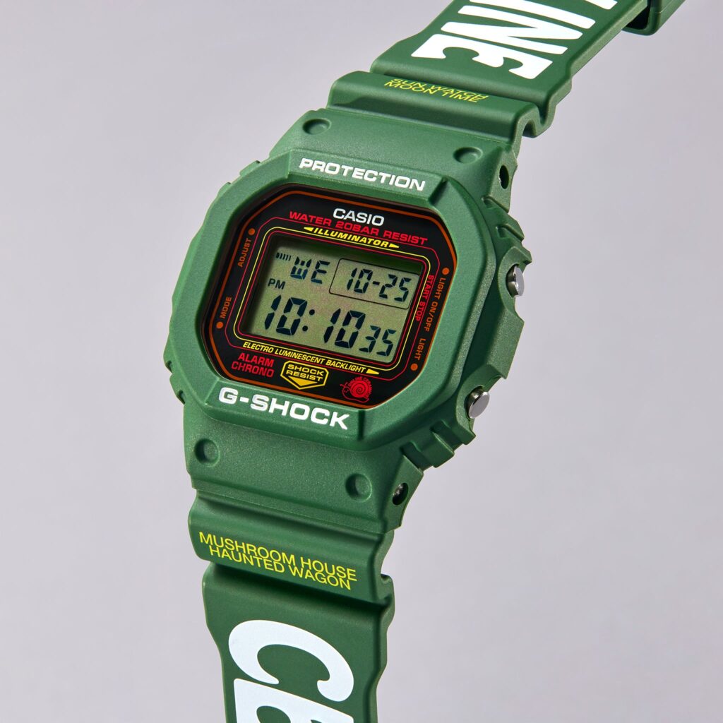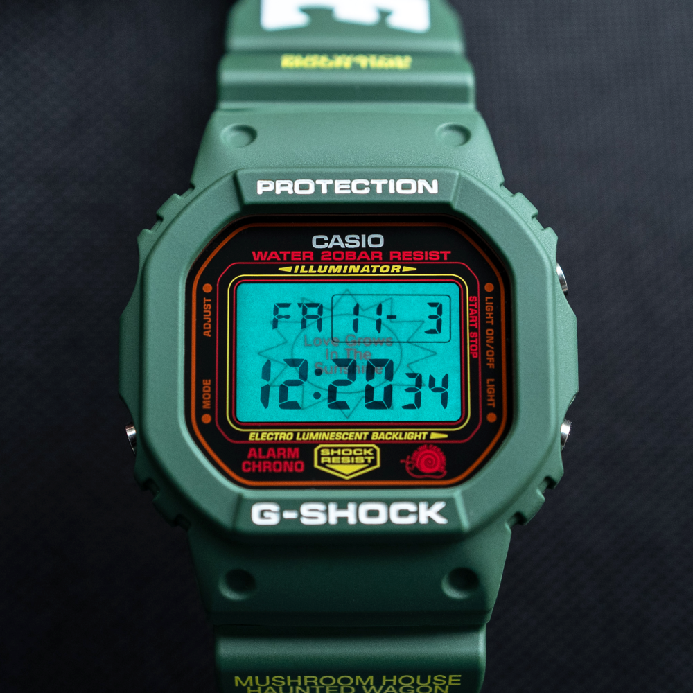 The green case of this Hodinkee x Online Ceramics G-SHOCK is framed by bright yellow text that reads “Sun Watch, Moon Time” and “Mushroom House Haunted Wagon.” This design takes its aesthetic inspiration from the Online Ceramics brand, which is known for its whimsical and psychedelic aesthetic. The timepiece also boasts a special easter egg: when the backlight is activated, a message appears on the screen that reads “Love Grows In The Sunshine.” This message can only be seen when the backlight is glowing, adding to the sense of mystery and intrigue that this watch exudes.