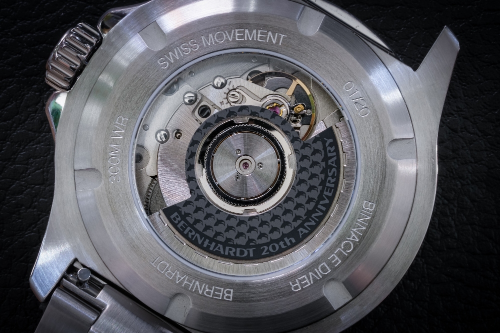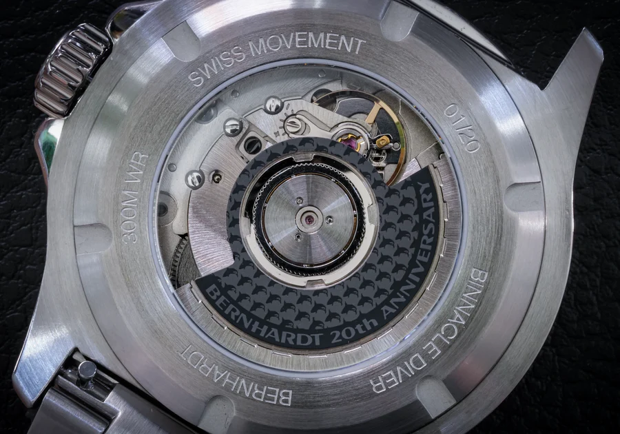 The SW300 is celebrated in the industry for its reliability and accurate performance, which is further ensured by Bernhardt’s US-based team who test and regulate each one to meet their rigorous standards. Turning the watch over reveals a truly special detail: an exhibition case back showcasing the movement and, critically, a custom 20th Anniversary rotor. This rotor is engraved with the original shark design from the very first Binnacle Diver, the watch that launched the company’s story, a perfect nod to the founder, Fred Amos, and his enduring vision.