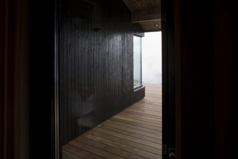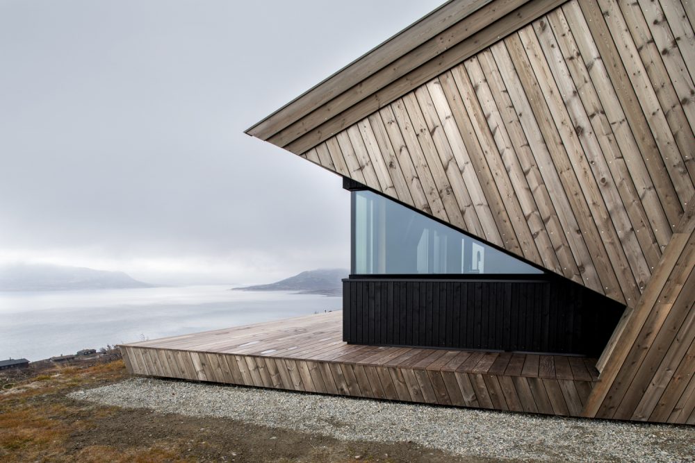 The Hooded Cabin from Arkitektværelset As is so-called because of the protective hood of the roof which aims to shield the property from being buffeted by the elements which are so apparent on this Norwegian island. The ore pine roof helps shield the “eyes” of the cabin in the front, and prevents rain from trickling down the main entrance into the cabin. The roof design has obvious practical functions, but at the same time, the contrast between the angled pine paneling and the black painted cabin body delivers a bold visual impact.