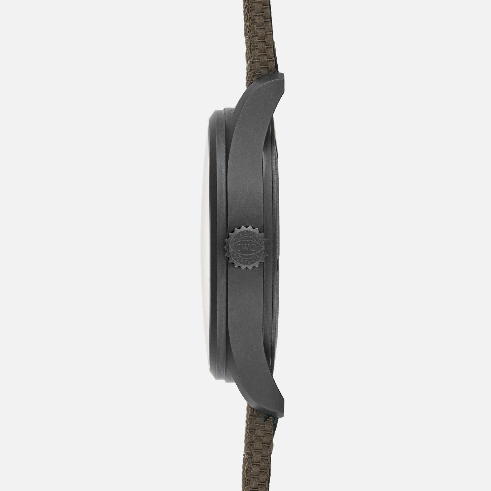 The 39mm case, is crafted entirely of Ceratanium®, which is a proprietary material IWC Schaffhausen has developed over the course of five years. Ceratanium® starts out as a unique titanium alloy containing zirconium oxide and, when heated, the zirconium oxide hardens into ceramic distributed throughout the metal itself. The colour turns matte black, and the end result is a watch which is lightweight like titanium, but with the scratch resistance and durability of ceramic i.e. the best of both worlds rolled into one.
