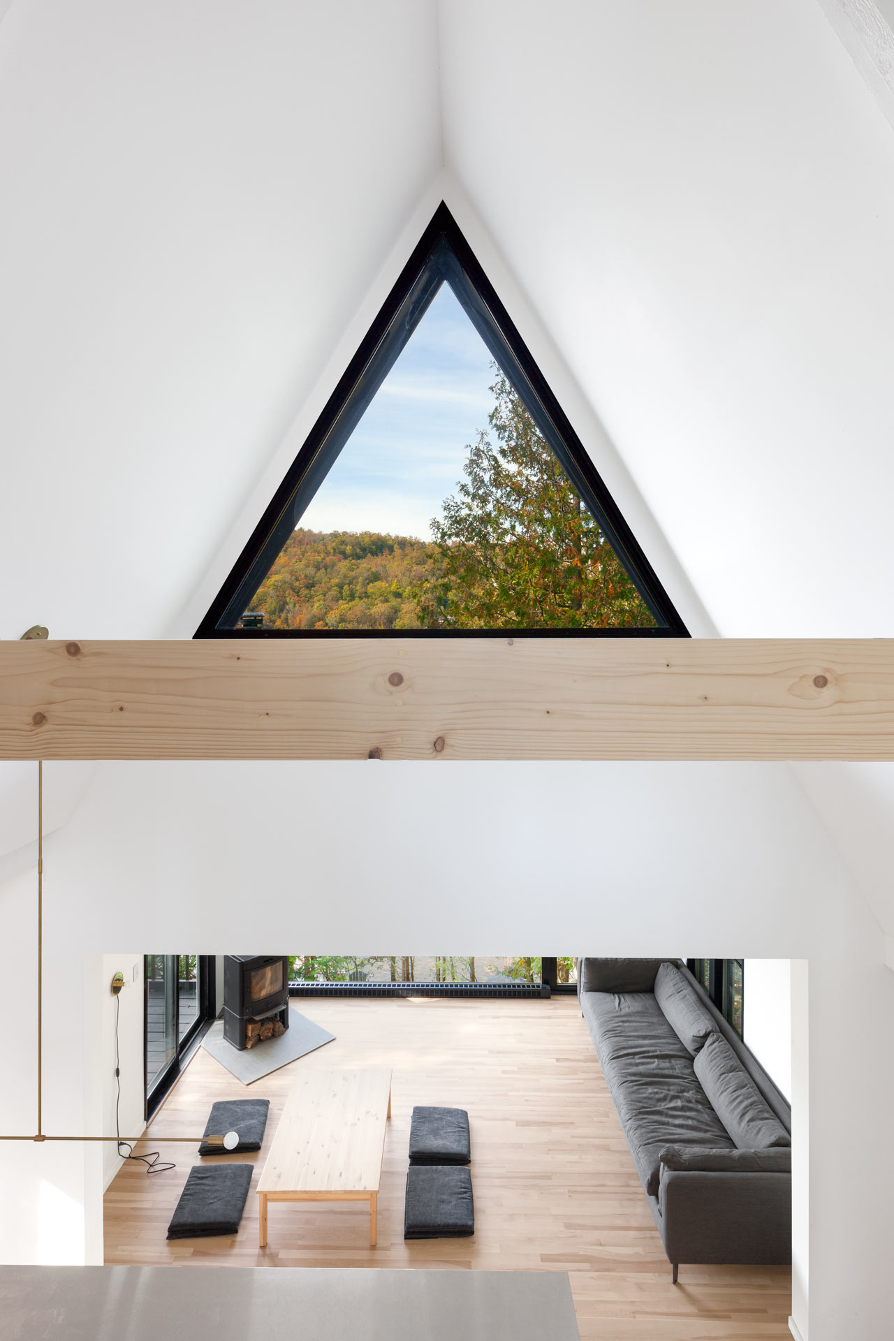 Gloriously understated on the inside, the A-Frame Residence from Jean Verville Architecte is a real treat for the eyes but also maximises the usability of the space and makes it work much more efficiently for the family that lives there. The new living room area will appeal to the nature lovers as it looks out on to the surrounding landscape, framing the stunning views that envelope the property. The living room joins to an attractive outdoor space and a small but perfectly formed kitchen.