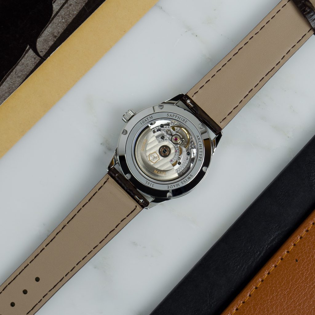 The automatic version of The Archetype features the latest in 1600s technology. Whilst you can’t reinvent the wheel, you can make it more accurate, reliable and beautiful. It is powered by the Sellita SW200 in its highest execution, beauty is balanced with functionality and reliable performance; parts and service are a breeze for life-long use, no matter where in the world you live. The polished sapphire caseback allows you to appreciate the artistry of the movement where Côtes de Gèneve, perlage, rhodium plating and blued screws abound.