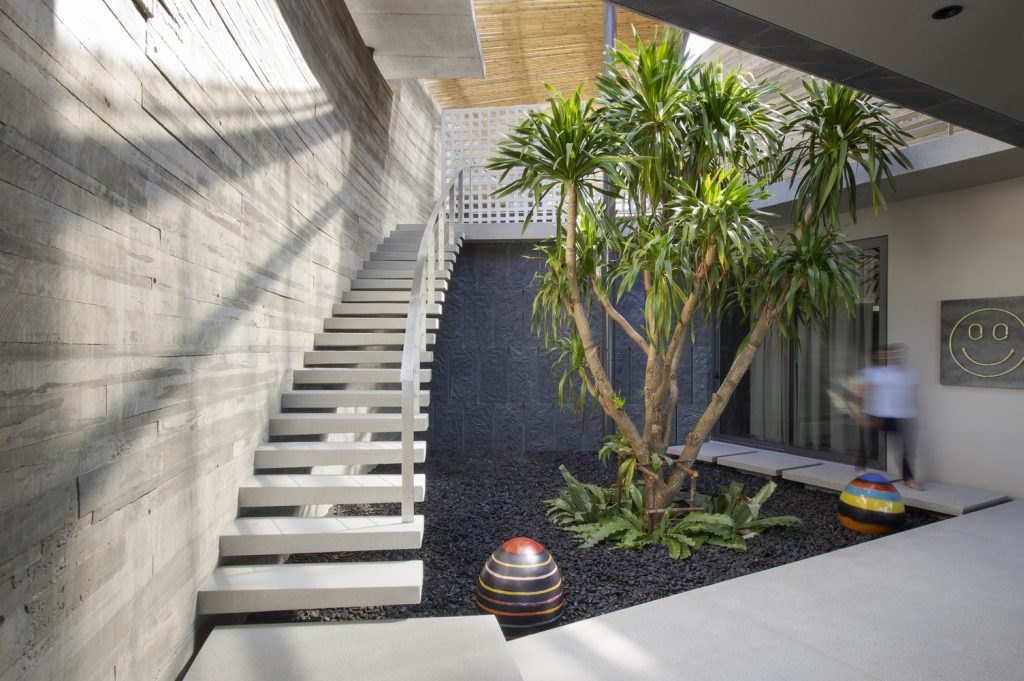 The site of the Kalim Beach House from Design Qua can be found on a hill that boasts a 180-degree view of awe-inspiring Kalim Bay. Beautiful as it is, this was a challenging narrow and vertical site for the design team that had to fit a lot of “house” on it but, as you can see, they’ve accomplished it with aplomb. The house is approached from the top level into a vertical courtyard with a grand staircase that leads the residents into the living and pool level situated below.