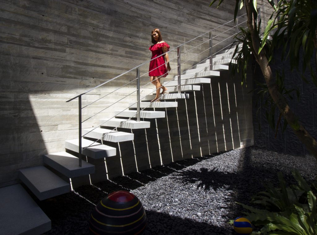 To shade the home from the strong tropical sun and for additional privacy, the designed added huge sliding bamboo screens which have been installed in front of all the upper floor bedrooms. Bamboo is used throughout the house for sun-screening -both vertically and horizontally and adds a pleasing rustic aesthetic . The living level is where a huge infinity-edged swimming pool extends out into the horizon like a giant circular mirror that reflects the sky while echoing the effortless curve of the bay.