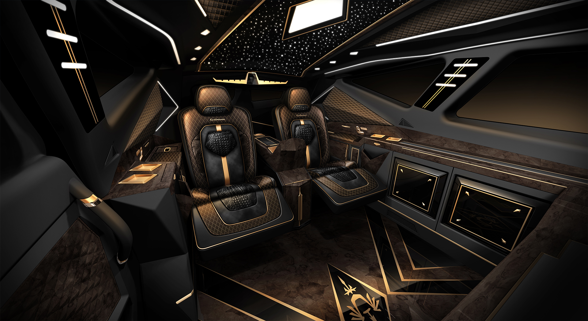 The Karlmann King isn’t just tough, though, it’s luxurious, too. The interior features high-class materials including leather, Alcantara, gold paneling, and beautiful dark wood. Interior features include mood lighting, and a starry ceiling, widescreen TV, refrigerator, Nespresso machine, PlayStation 4, a small safe and pop-up tables for dining, working or doing whatever you please.