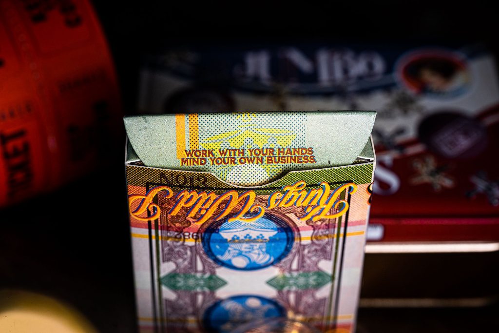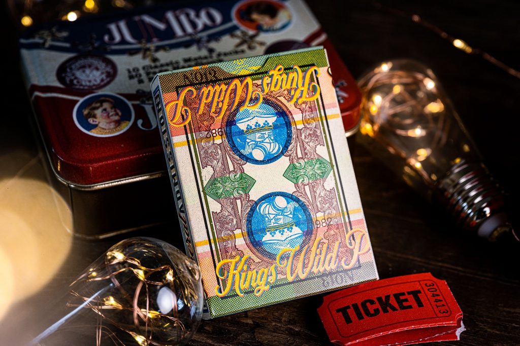The Kings Wild Project General Admission Playing Cards ($15) is printed by EPCC and the semi-gloss tuck case is designed to resemble the layout of a ticket stub, including the gate number, section, row, and seat, which hide an Easter Egg for those who follow Jackson’s design themes closely. The complex back design plays along the same lines, and adds design elements resembling some of Kings Wild’s currency decks, along with the iconic logo.