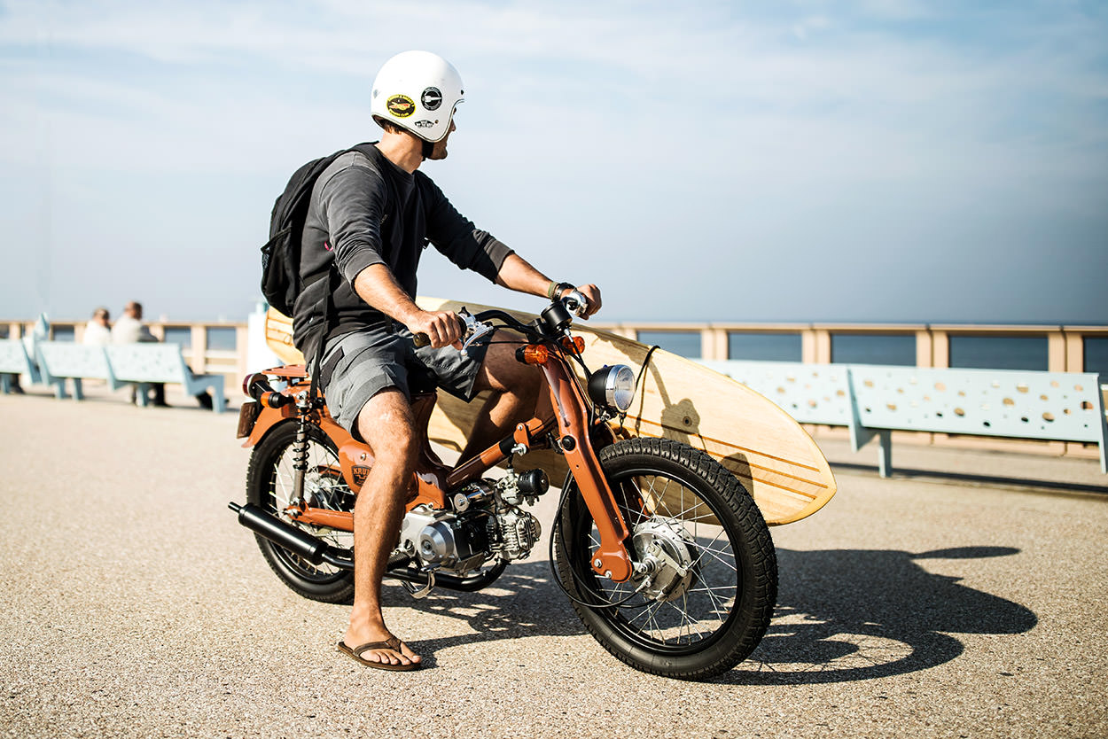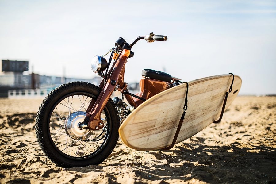 The El Gordo Motorbike from Kruk Customs is a real slice of summer and surfing lifestyle with its cool, vibrant aesthetic which has been carefully tailored to ensure it fits in with the way the surf inclined live their lives. This first class contraption is the flagship creation of Kruk Customs and it very much looks like they’ve hit a home run right off the bat. This super cool steed is built upon a Super 50, a Chinese-made Cub clone which has been imported by Super Motor Company in Amsterdam and the finished product is striking to say the least.