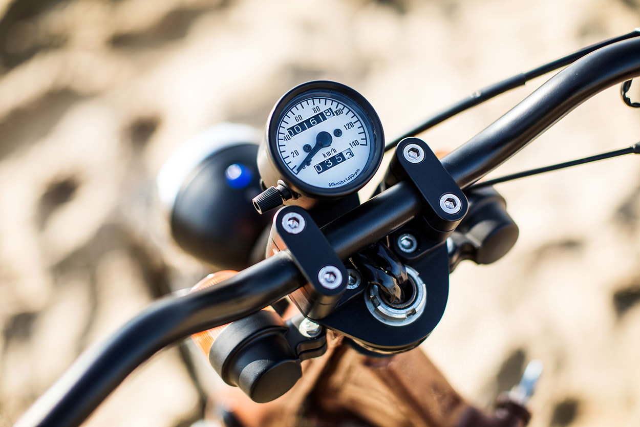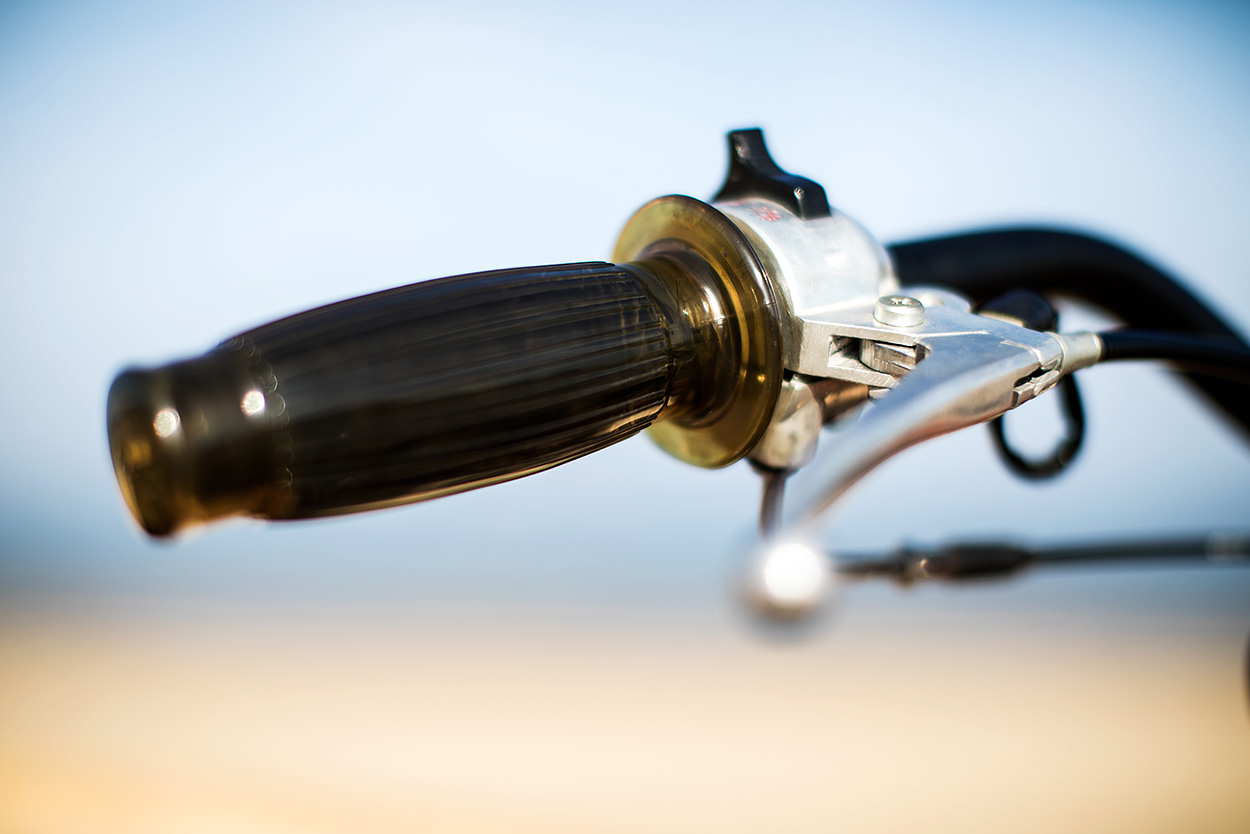 Totally dismantling he steering and headlight set up and rebuilding it piece-by-piece, the El Gordo Bike really began to take shape and look the part. They began with a bespoke-made top yoke and a set of aftermarket handlebar clamps and the handlebars themselves are sourced from a 70s Honda CB and finished off with top notch Beston grips that add a nice visual punch to the proceedings.