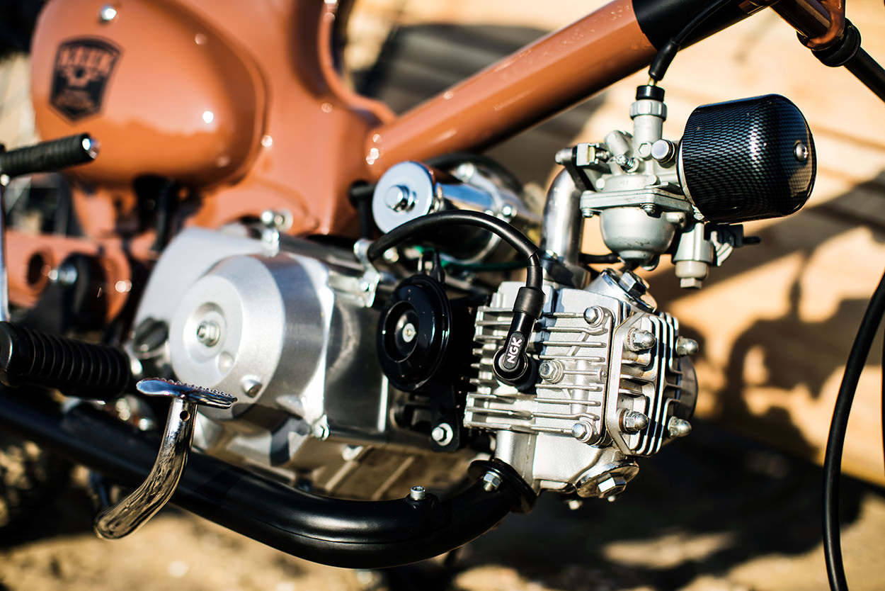 The Kruk Customs El Gordo Motorbike does away with the Super 50’s plastic rear fender and have welded in a shortened Honda Cub number with a super cool ducktail on the end for a much more stand out profile for the bike. After this, they chucked on a luggage rack and taillight from their mishmash selection of parts they sourced and the visual impact is very fitting for the surf culture they’re so fond of.