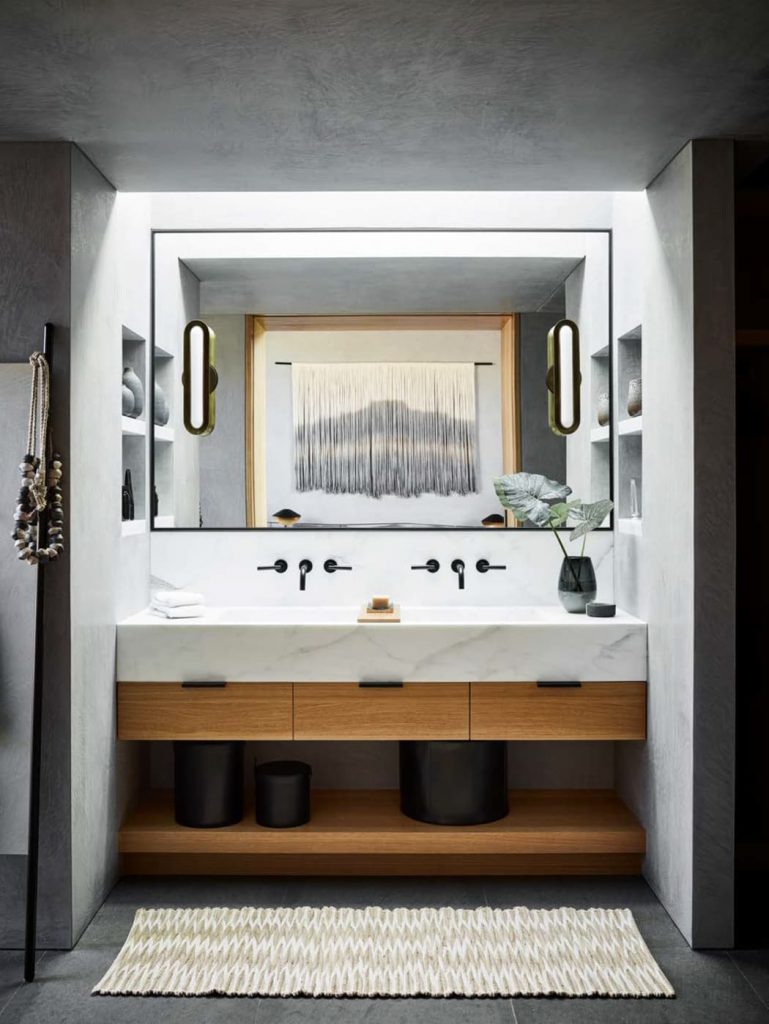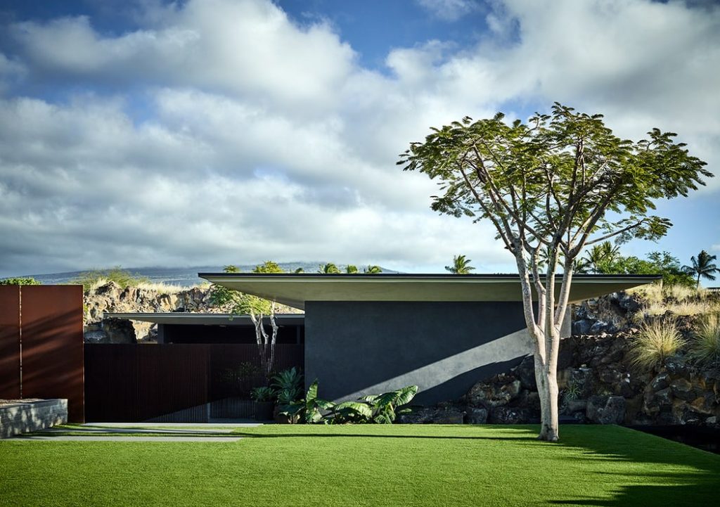 The challenge with Kua Bay House from Walker Warner Architects was to manipulate the plot so that the buildings would perfectly fit in with the existing landscape while ensuring a graceful and multi-layered experience from mountain to sea. The sheltered driveway found on the mountain side of the home cuts into existing 15 foot high lava rock formations, which shields Kua Bay House from surrounding neighbours and lessens its visual impact from the roadway.