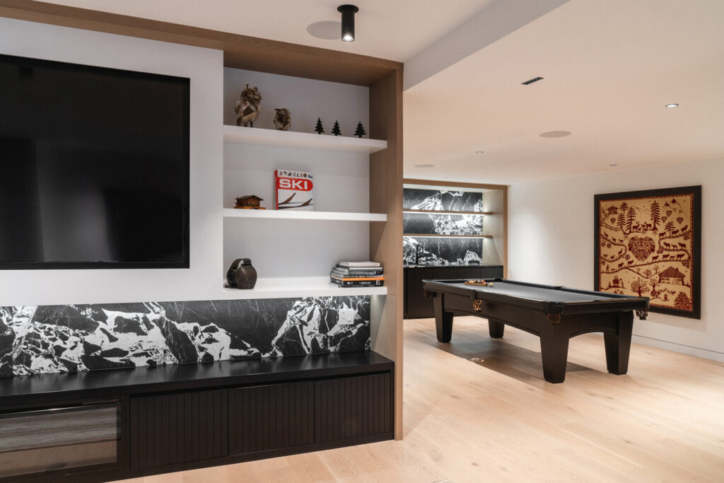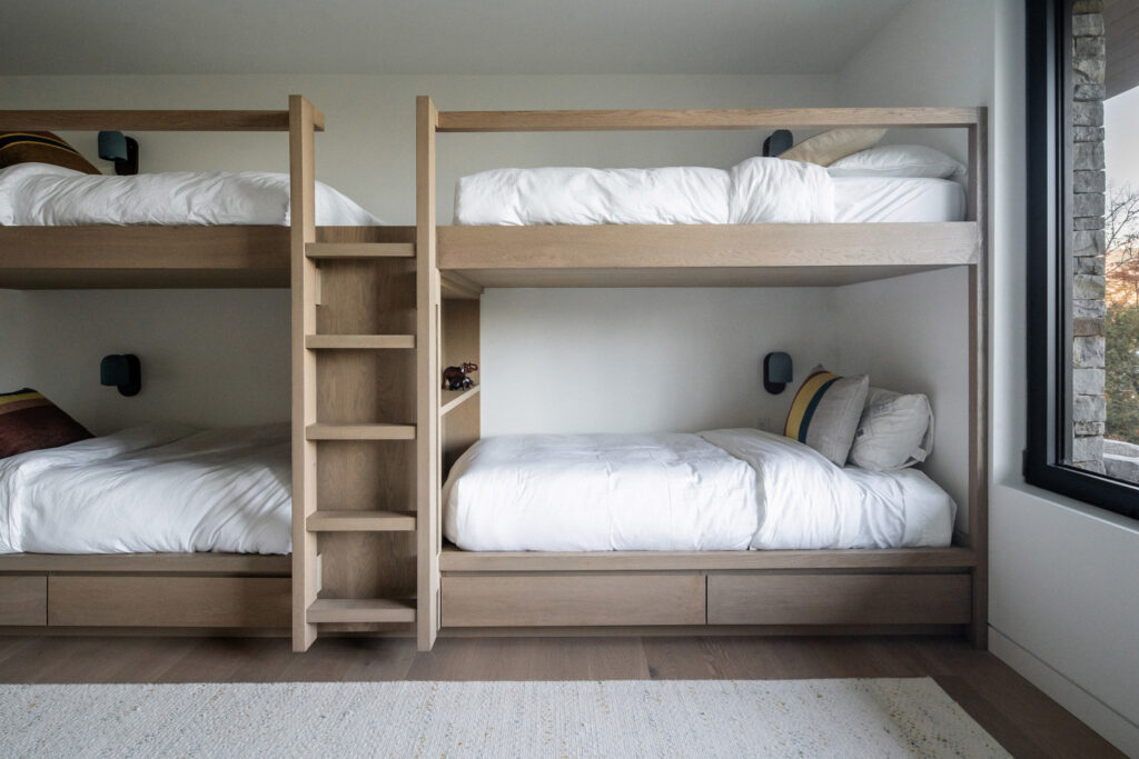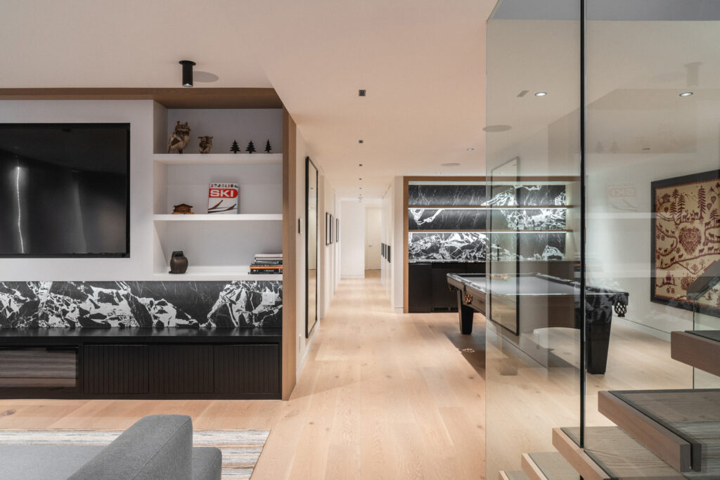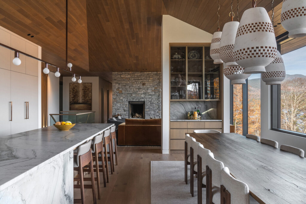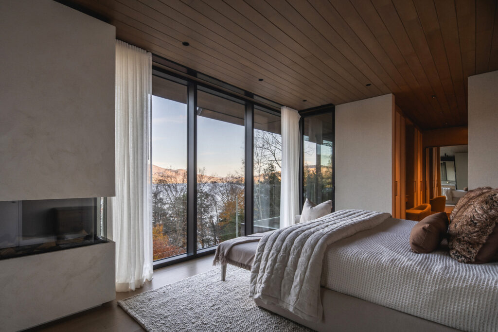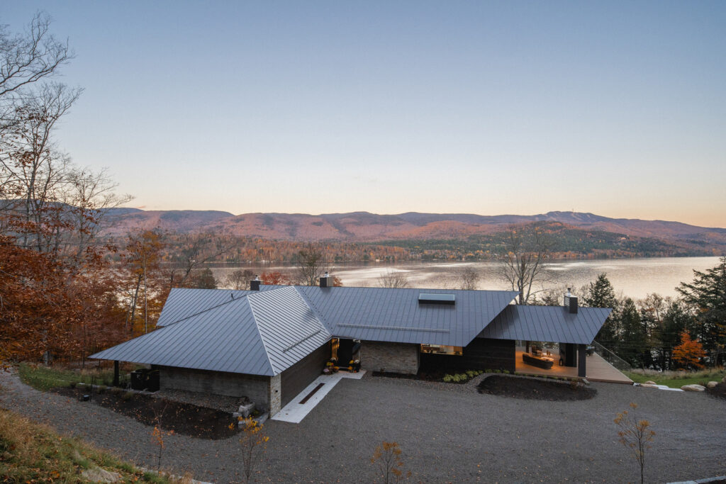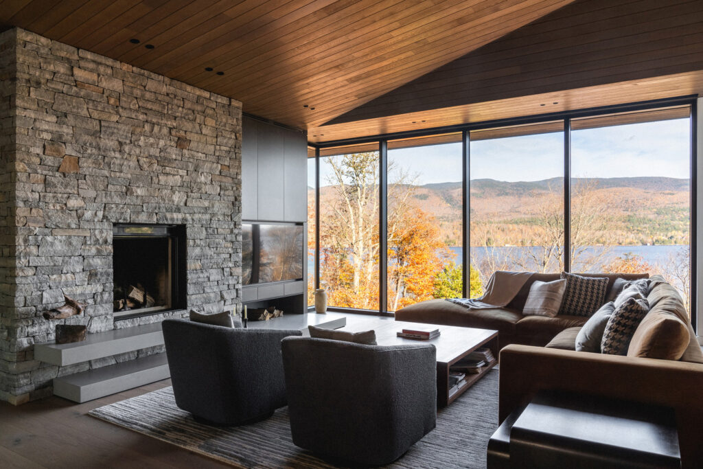 The residence’s name, La Flèche—French for “the arrow”—is beautifully embodied in its striking roofline. A series of overlapping roofs telescope skyward, creating a dynamic rhythm that welcomes visitors with dramatic flair. These razor-thin eaves and seamlessly integrated ventilation details give the home a precision-cut appearance, a sharp contrast that only enhances its natural setting. Beneath the steel, warm wood slat soffits evoke the feeling of flesh beneath a protective shell, adding a tactile, inviting quality. The main body of the house, clad in wood and dry-stacked stone, ensures it blends effortlessly with the surrounding forest and earth, a true architectural chameleon.