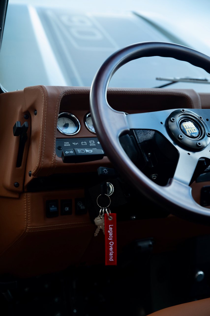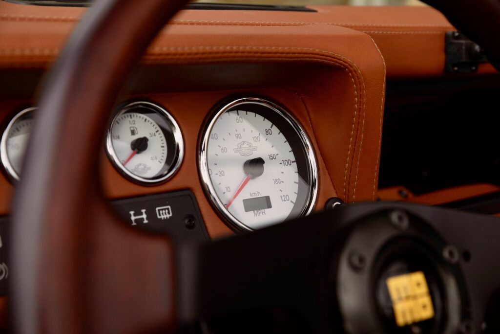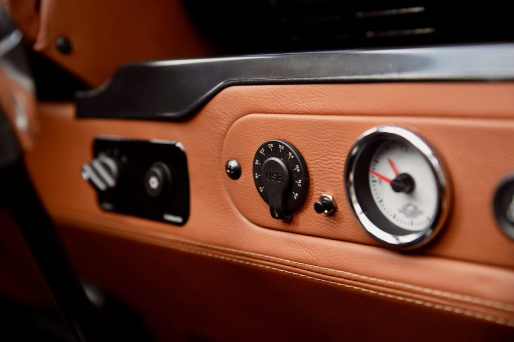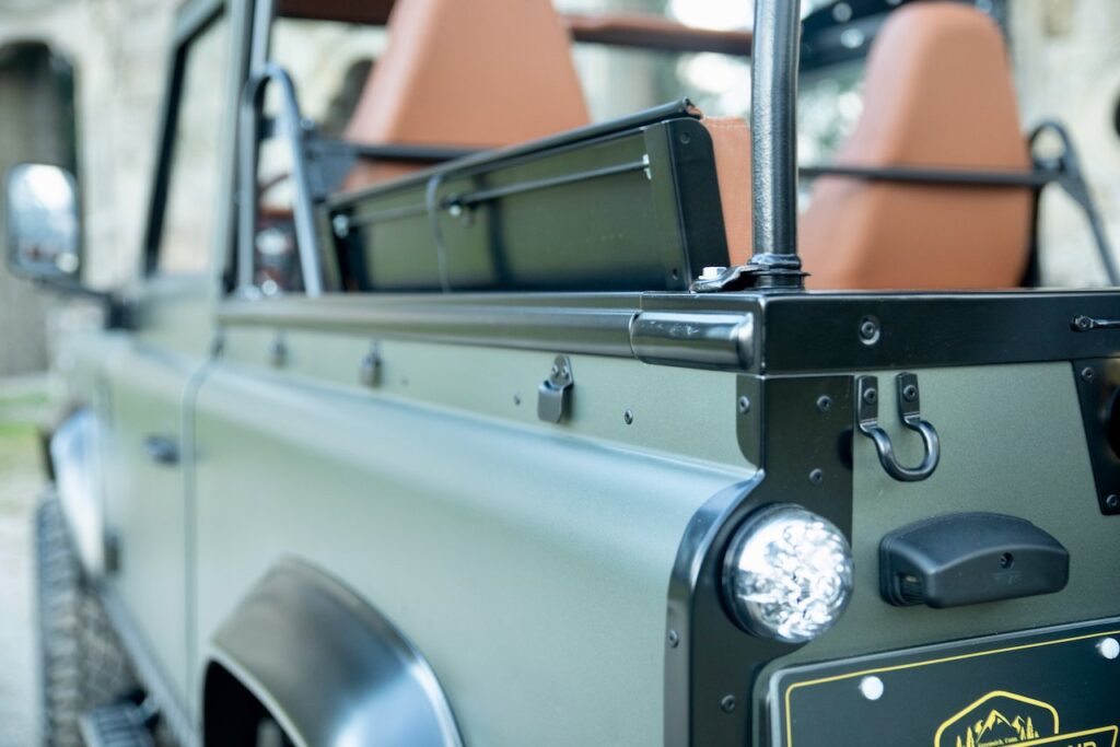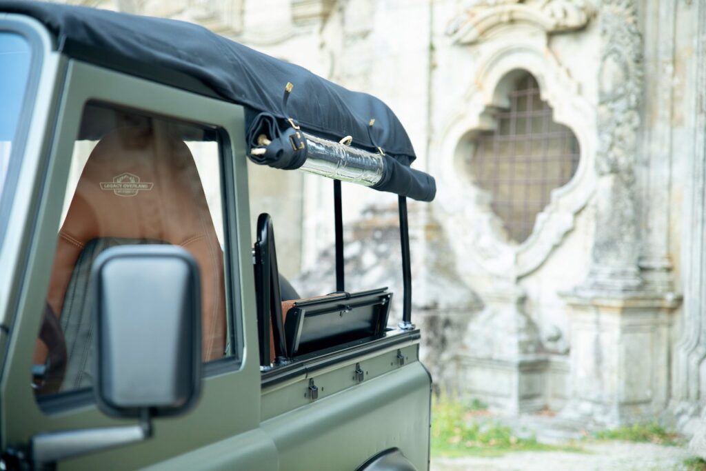 There is a real sense of luxury to this Legacy Overland 1990 Land Rover Defender 90 Soft Top and the front seats have been upgraded to Porsche 911-type bucket seats with high head rests and plenty of additional support for energetic off-roading. The interior is dressed in hand crafted tawny vegan leather with black chevron stitched patterning on seats, doors and cubby box. Shifters are made out of billet aluminium, which delivers a sharp finishing touch as well as uncompromising toughness.