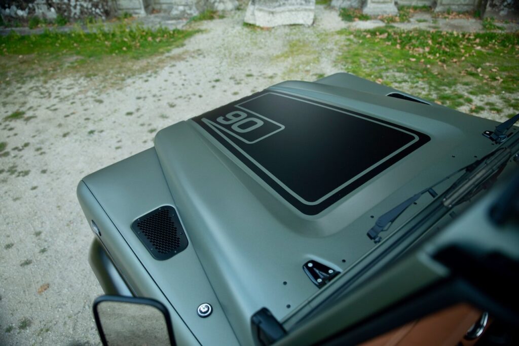 The Defender 90 soft top is right up our stylistic street here at Coolector HQ and it is impeccably finished in a satin Pangea green with black details and, as the name suggests, a soft top. The front of this Defender was upgraded with a KBX grille and LED high-power headlights. The hood got a spruce-up with a satin black reflection abating cover with a “90” stencil as a nod to its heritage. The truck rides on capable alloy wheels with no-nonsense Cooper tires.