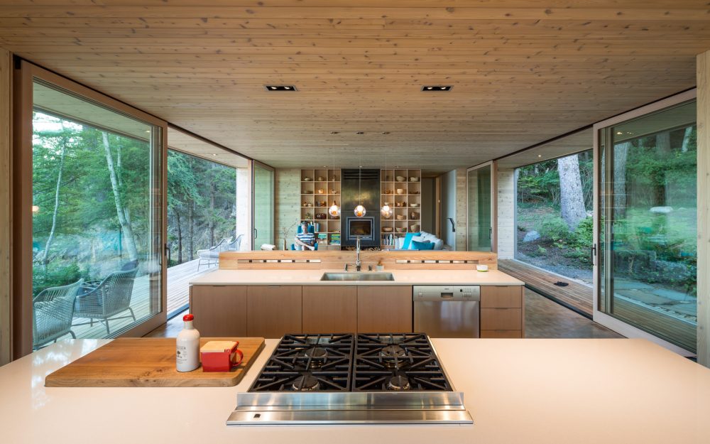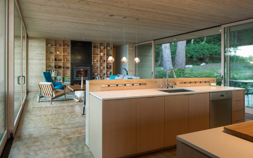 The bedrooms of the Lone Madrone Retreat from Heliotrope Architects focuses predominantly on the more private, forested slope to the west and the kitchen opens onto an adjacent rock promontory to the east of the structure. As a result of the extreme weather exposure of the site, major openings are paired with rolling wall panels to protect them from punishing winter storms, as well as to provide security when the home is left unoccupied.
