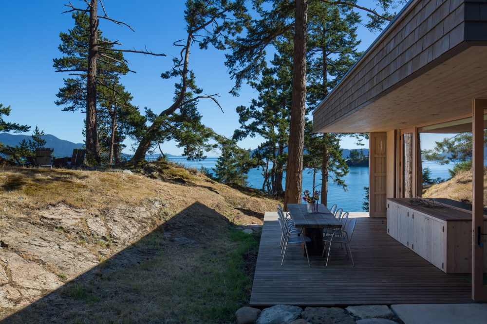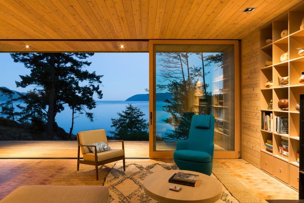 Colour is a big component of what makes this Lone Madrone Retreat so special from an aesthetic perspective and it has been carefully considered both inside and out. The finish palette consists of an array of local materials which includes douglas fir (floors, trim), western red cedar (siding, wall and ceiling cladding) and pacific madrone (furniture). The site is within the San Juan Islands National Monument, with extremely sensitive shorelines and marine environment so it occupies a very special place and serves as an incredible retreat for the lucky owners.