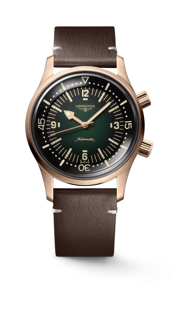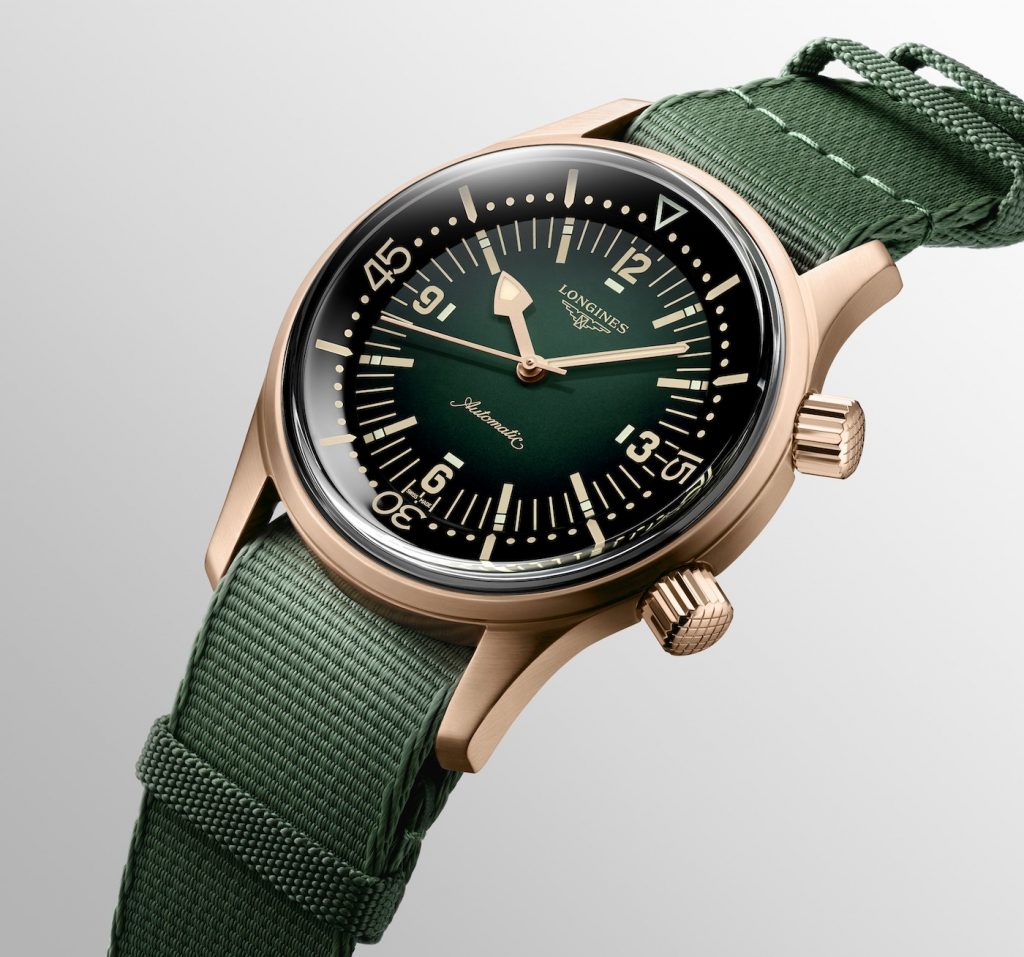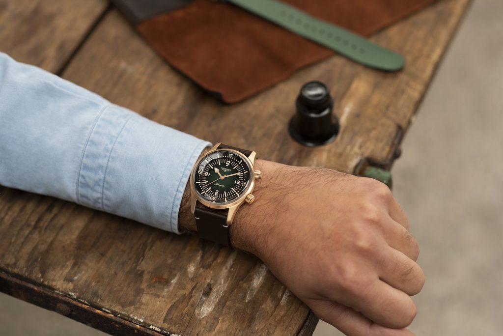 The dial of the bronze Longines Legend Diver keeps the styling of the rest of the line, and this includes an internally rotating bezel, Arabic numerals at 3, 6, 9, and 12, and an eye-catching and highly legible handset. What truly sets this model apart from the crowd is the deep emerald-green lacquered dial, which darkens to black at the periphery. The dial is beautiful; and when combined with the gilt hands and markers and framed by the bronze case, the effect is captivating and evocative of years gone by.