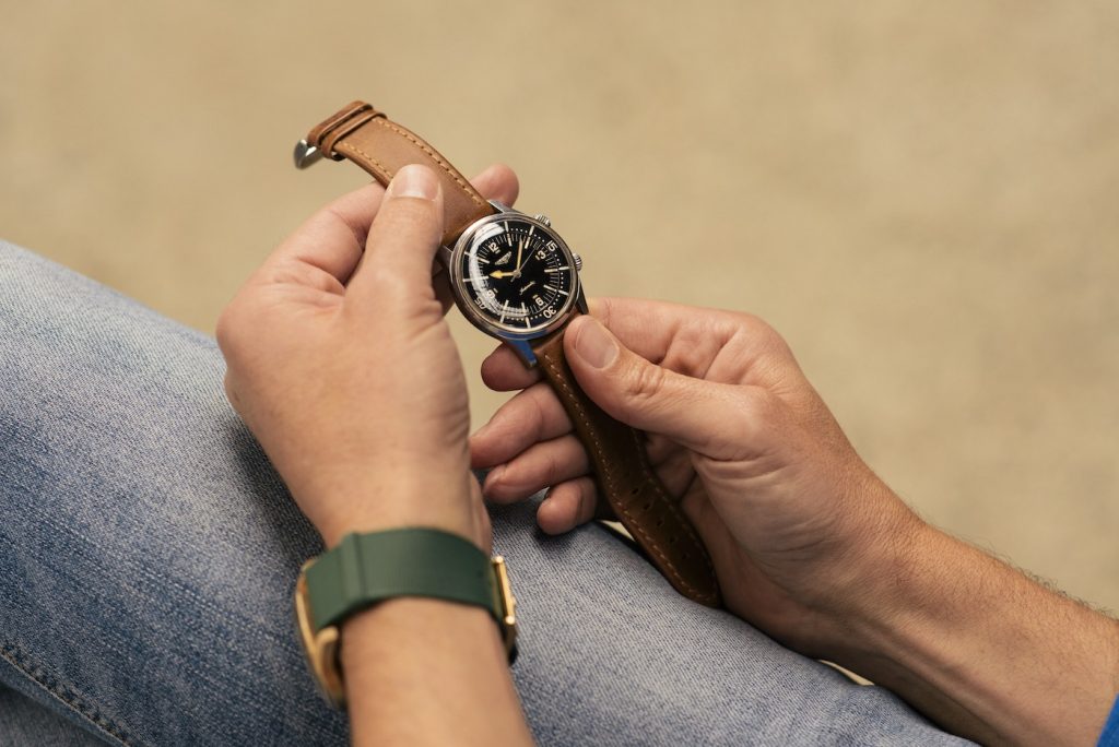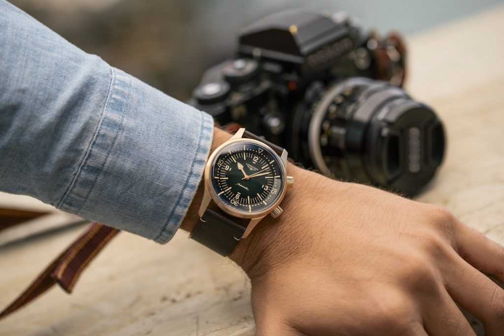 The Longines Legend Diver Watch ($3000) has a super-compressor design which is a mighty impressive feat of engineering, whereby increasing water pressure will also increase the pressure on the seals which, in more simple terms, means that the deeper you go, the tighter the seal will be. The case design, internal bezel, and dual hash-marked crowns are hallmarks of this style, and these visual cues are all heavily evident in this modern line of Longines Legend Diver watches.