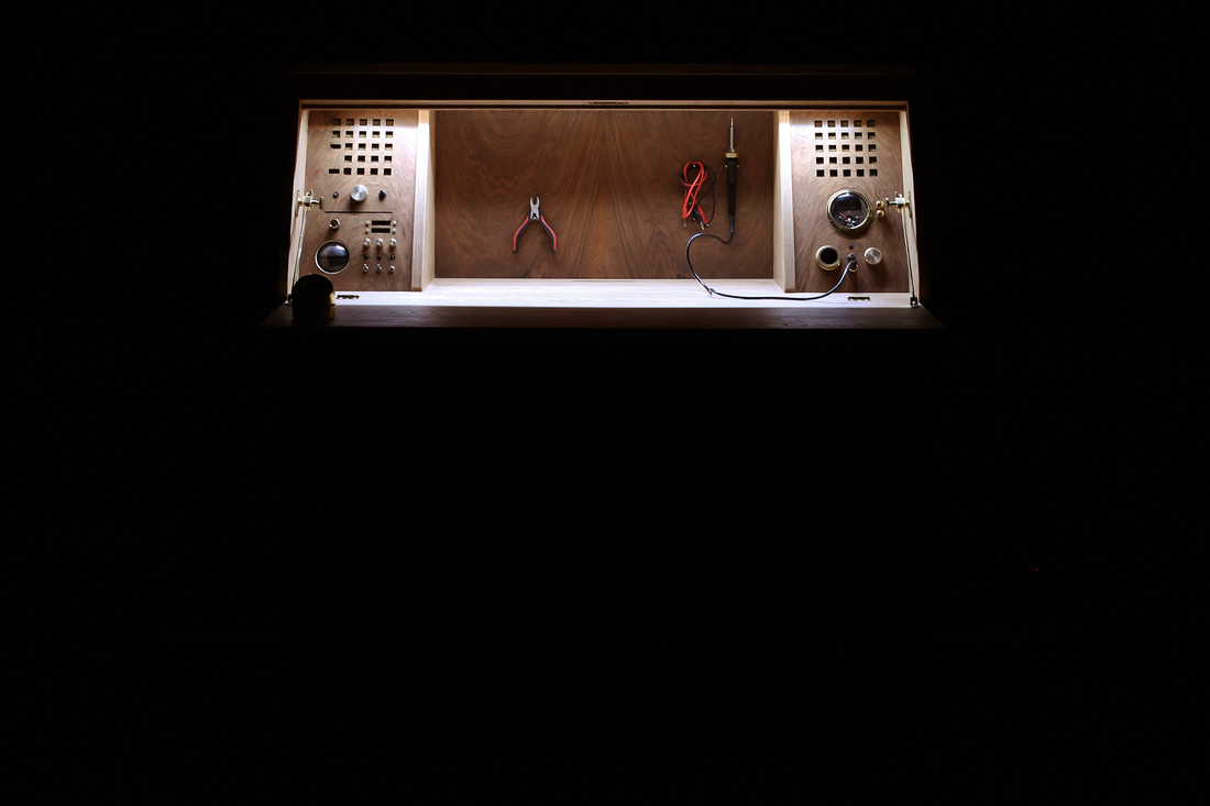 With an abundance of storage space (26 drawers), the 43 x 43 x 16-inch workbench successfully integrates a bevy of electronic apparatus which includes a built-in high-end computer along with a 2.1 speaker system that allows it to function as a high-tech working environment. On the inside of the Tempel Workstation, you’ll discover a motor driven hidden pop-up 24″ monitor covered in a striking walnut frame and a built-in soldering/electronic station with a selection of customised tools, crafted with the owner’s needs in mind.