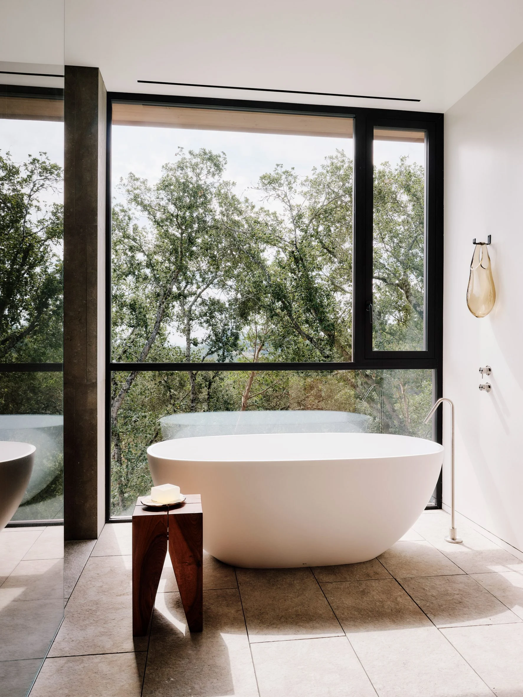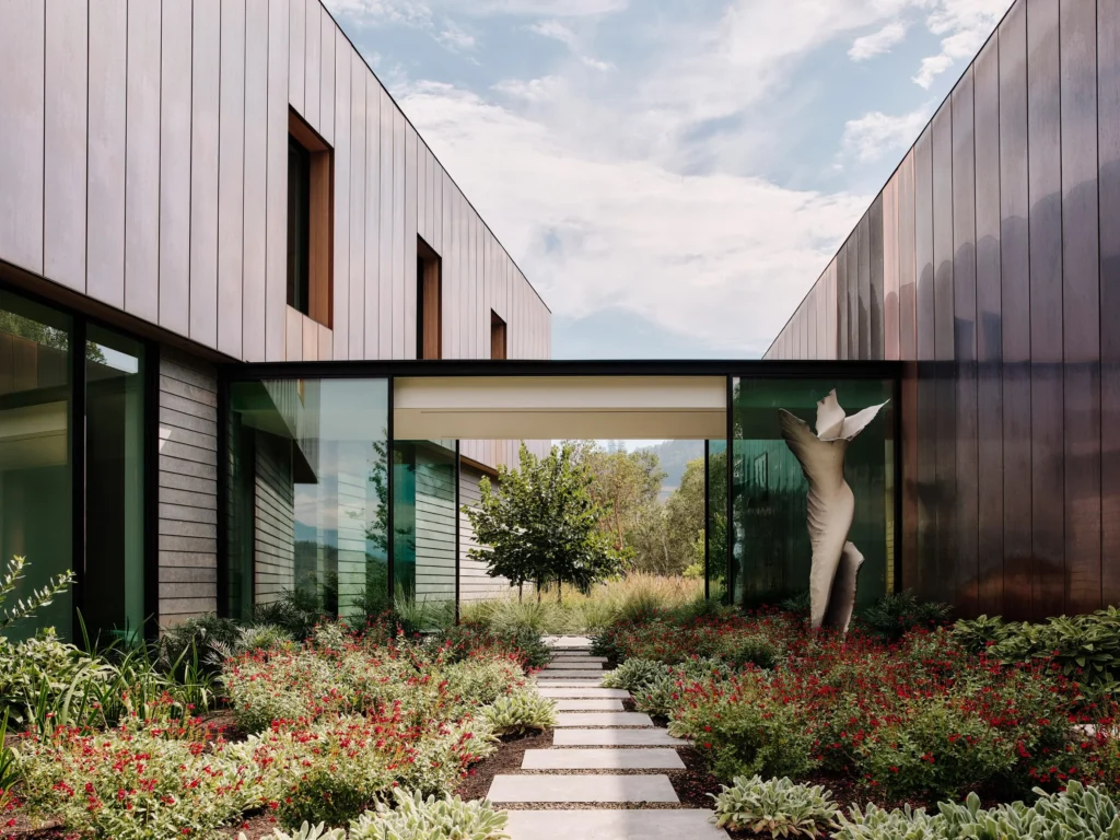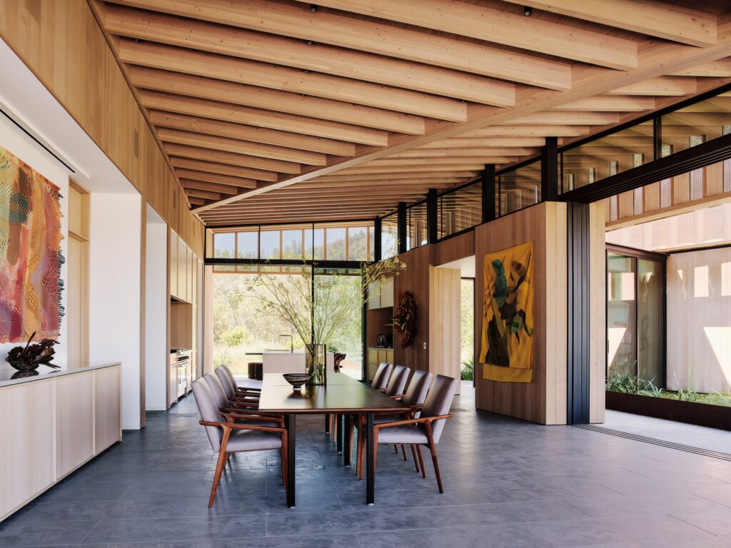 Nestled among trees on a hill that overlooks the valley’s iconic vineyards, Madrone Ridge House from Field Architecture beckons residents and visitors along a gravel and stone pathway and into the majestic-looking property. A 500-year-old cedar wedge serves as a bench in the entry garden and it is the perfect spot to sit and reflect. The property’s design takes inspiration from the flow of water, with copper-clad pavilions connected by glazed corridors. The pavilions are supported by two stone bases, which is where you’ll find the home’s main living spaces.