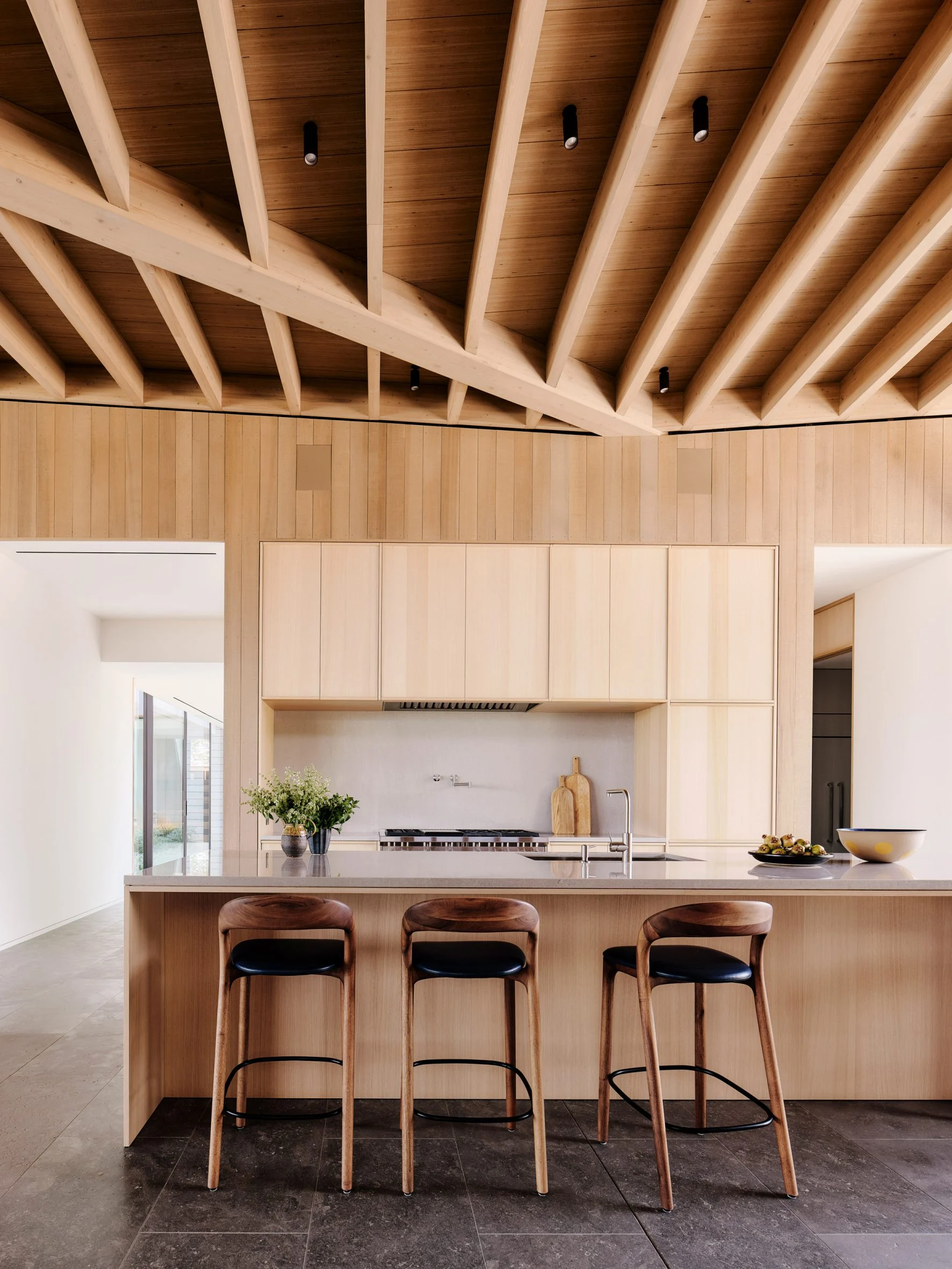 The roofs of Madrone Ridge House consist of two triangular planes each that slope toward the centre of the property and these are purpose built to collect rainwater and redirect it to river-rock basins. The roof planes fold down along the edge of each pavilion, turning to copper screens that provide striking shadow patterns on the interior areas of the home and create a visually engaging element to the interior design aesthetic. The palette for the interiors uses natural materials such as stone and oak and madrone wood finishes that really make it a relaxing space for the owners.