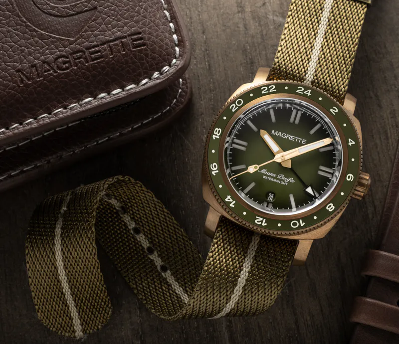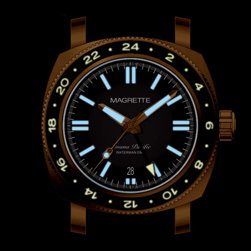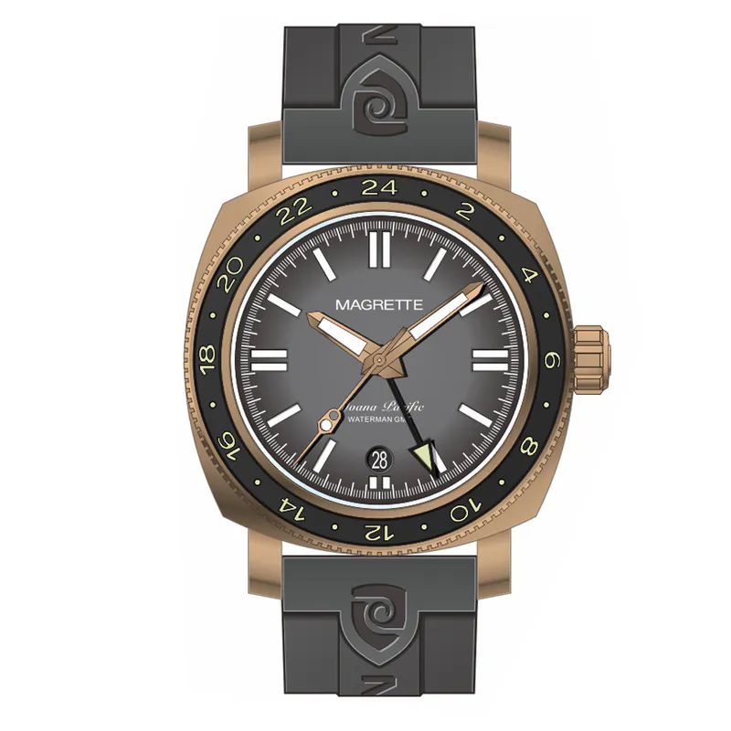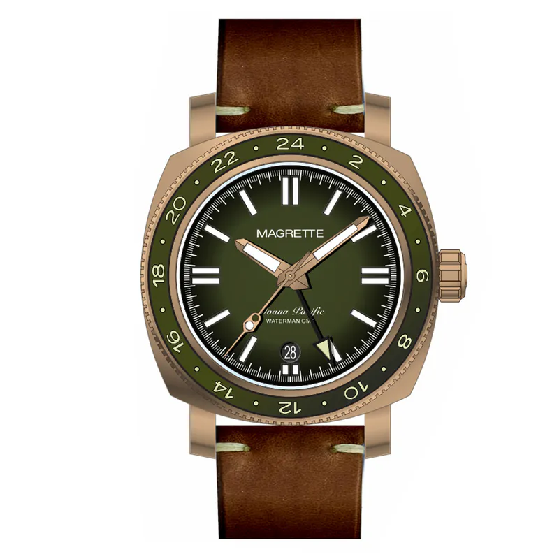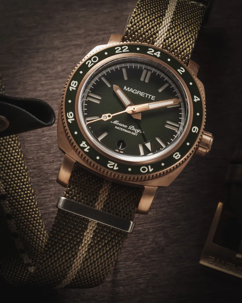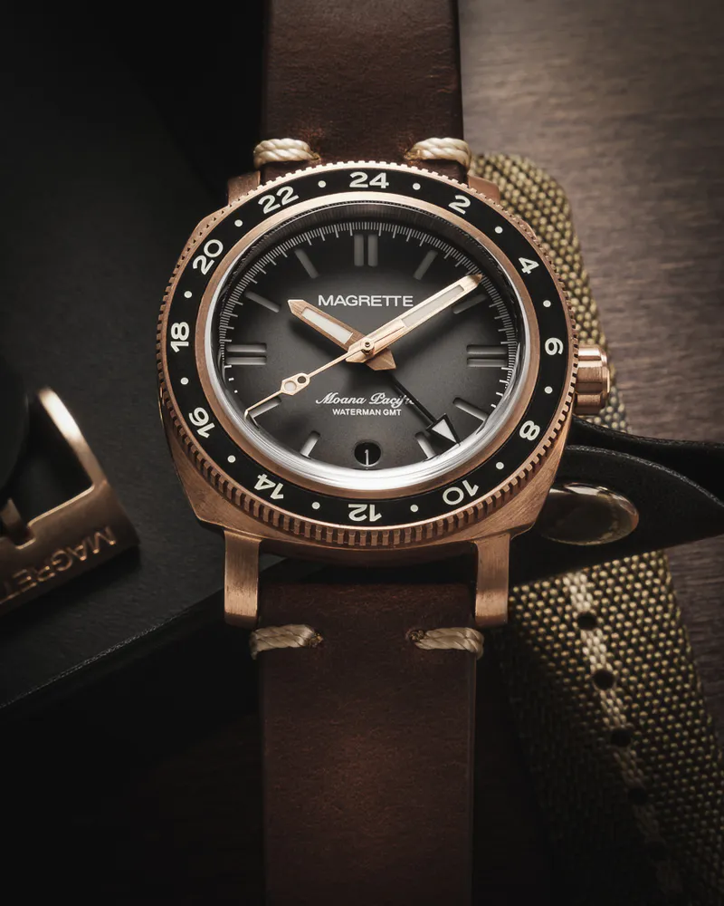 Whether paired with the custom Magrette embossed FKM rubber strap, a classic NATO, or the brown vintage minimal-stitch leather, the Waterman GMT Bronze is a versatile timepiece that effortlessly transitions from the depths of the ocean to the heart of the city. With only 150 pieces available in each colour, this limited-edition watch is destined to become a coveted item for collectors and enthusiasts alike—an embodiment of Magrette’s passion for blending heritage, functionality, and timeless style. Get ready to chart your own course with this exceptional watch by your side.