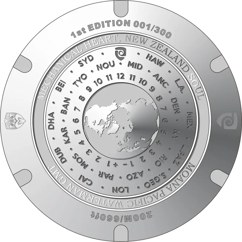 Crafted from marine-grade CuSn8 bronze, the Waterman GMT Bronze case is built to age gracefully, developing a rich, hard-wearing patina that tells the story of your travels. At 40mm in diameter and 14mm in height, it’s compact enough to wear comfortably on any adventure but robust enough to endure the elements. The case back is intricately engraved with world time zone offsets, enhancing the watch’s travel-inspired aesthetic. This bronze beauty is topped with a sapphire box-style crystal, complete with an anti-reflective coating, ensuring both durability and clarity.