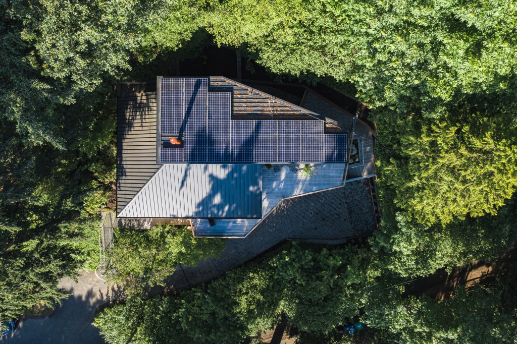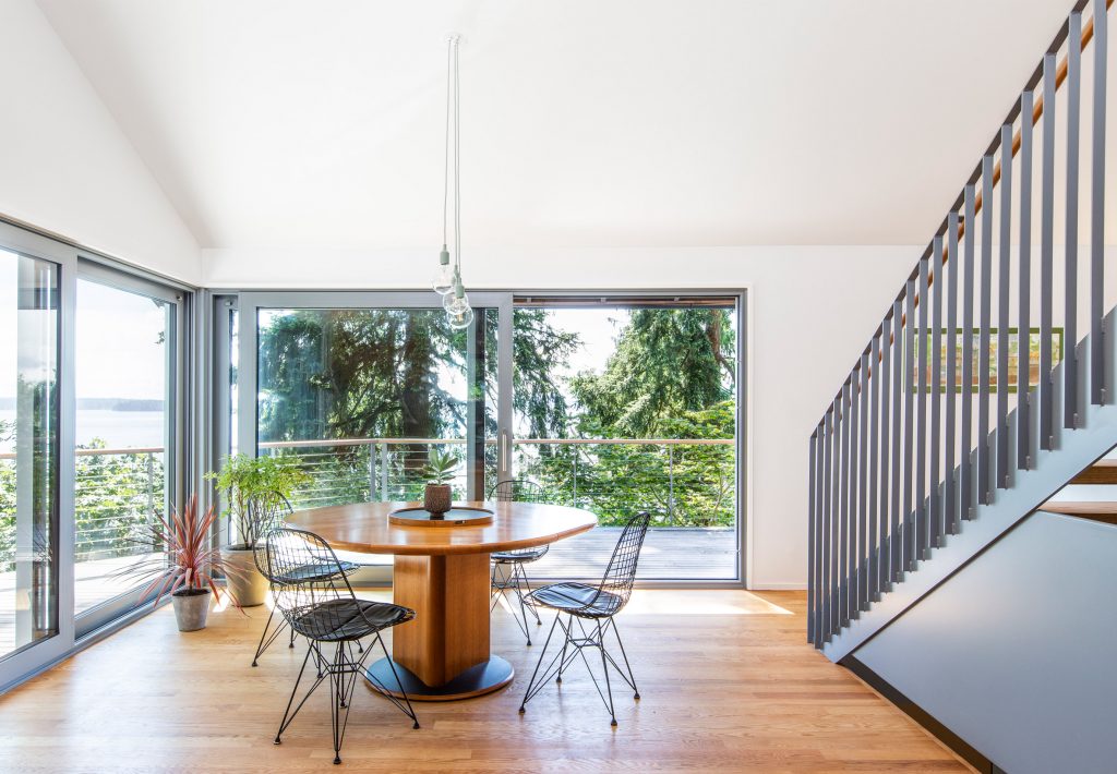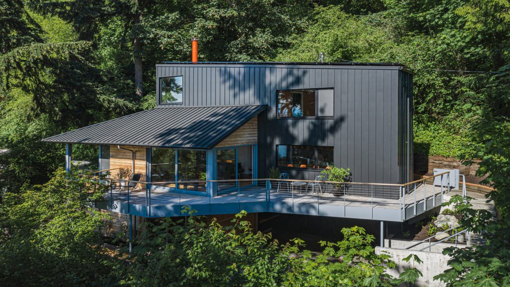 A key element of the design brief from the former circus performer owners was for the small individual spaces to open, and become interconnected spaces with big views to forest and water and, as you can see, the designers at SHED Architects have pulled this off with some considerable aplomb. In order to modernise the Me-Kwa-Mooks Net-Zero house’s stripped-back exterior, SHED clad one of the volumes in wood and the other in standing seam metal panels and this provides a pleasing juxtaposition.