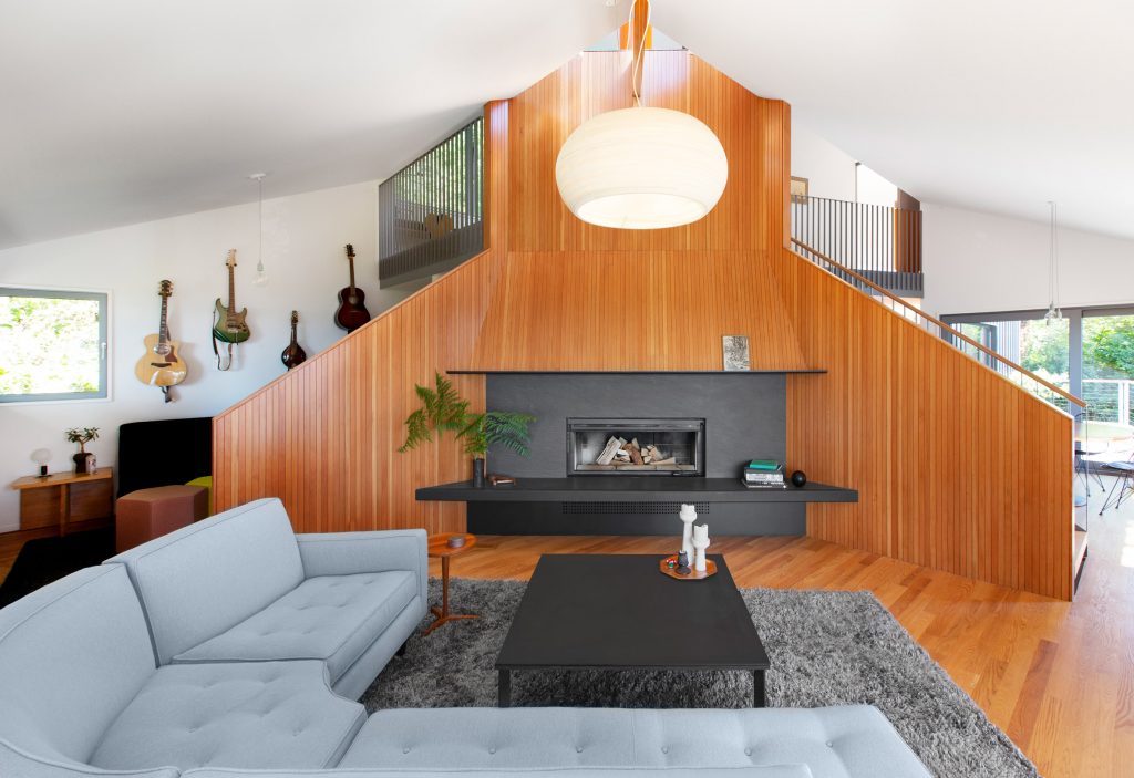 This flue is modelled on the mast that supports a pitch of a circus big top (another nod to the owner’s circus performing past). While paying tribute to the clients’ history, it also helps to stitch the two volumes together internally. On the middle floor, three different but interconnected rooms are positioned around this hearth to replicate a three-ring circus. This includes a dining room, living area and space for performing music. The bedrooms are found on the upper floor, next to an office that is visually connected to the three rooms below to create the feeling of sitting up inside a big top.
