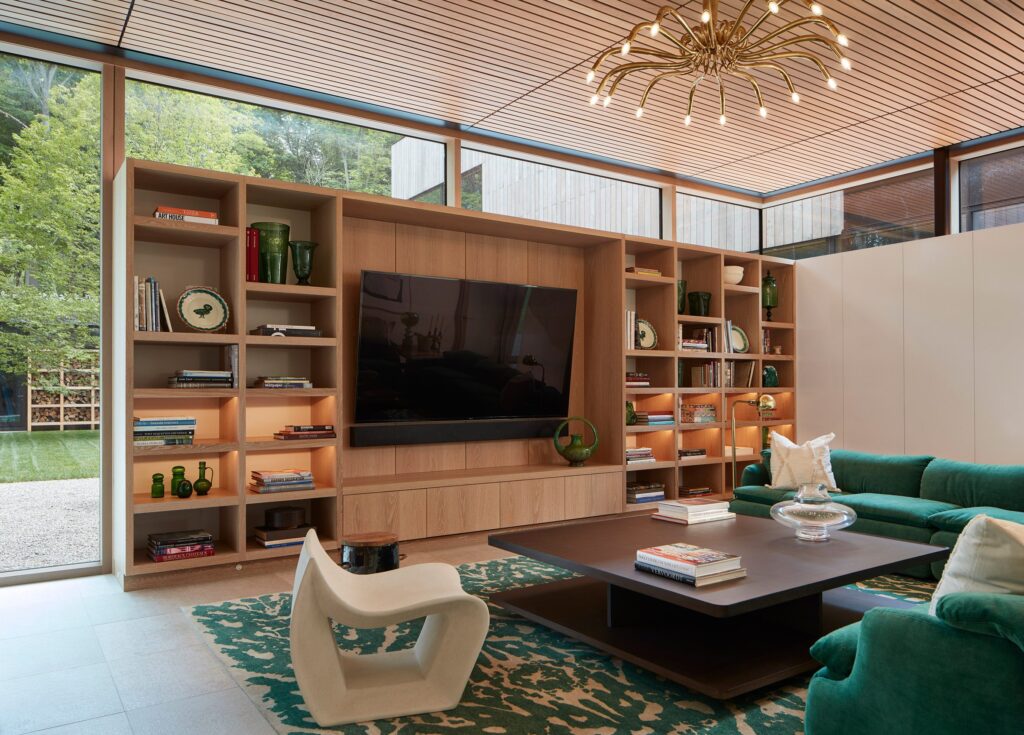 Architecturally, the Meadow Lane Retreat is wrapped in natural materials that reflect its woodland setting. The ground floor is clad in Accoya tongue-and-groove siding, stained dark to evoke the texture of tree trunks. Meanwhile, the second floor is finished in interlocking black locust boards, which will weather beautifully into a silver patina over time. The entire home rests on a limestone wall base, with floor-to-ceiling glass openings that connect the interior spaces to the outdoor pool terrace and offer expansive views in multiple directions.