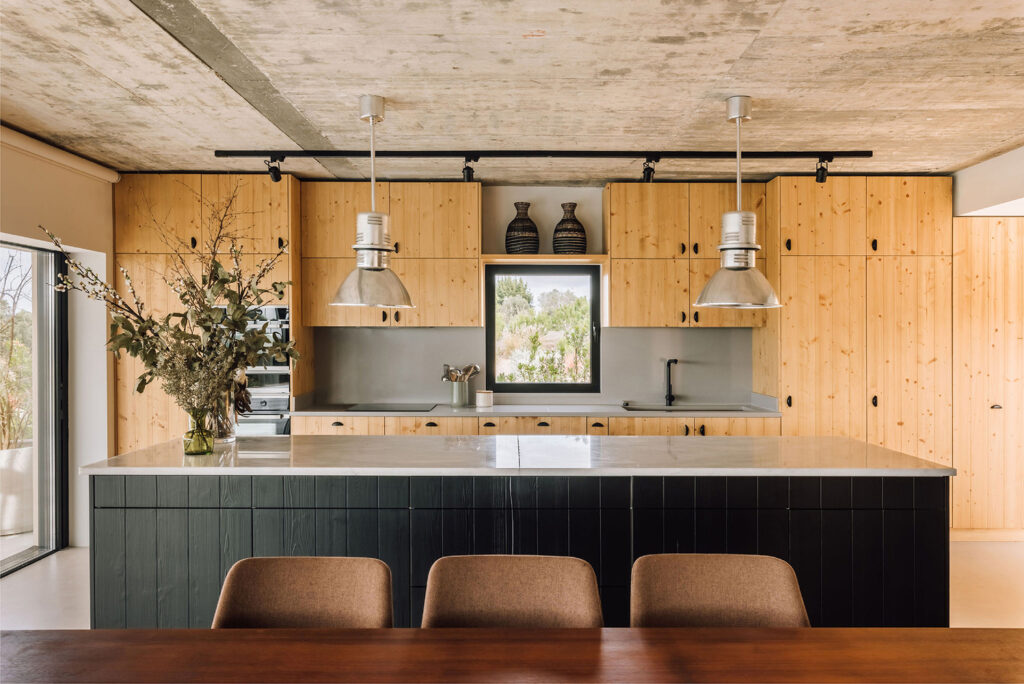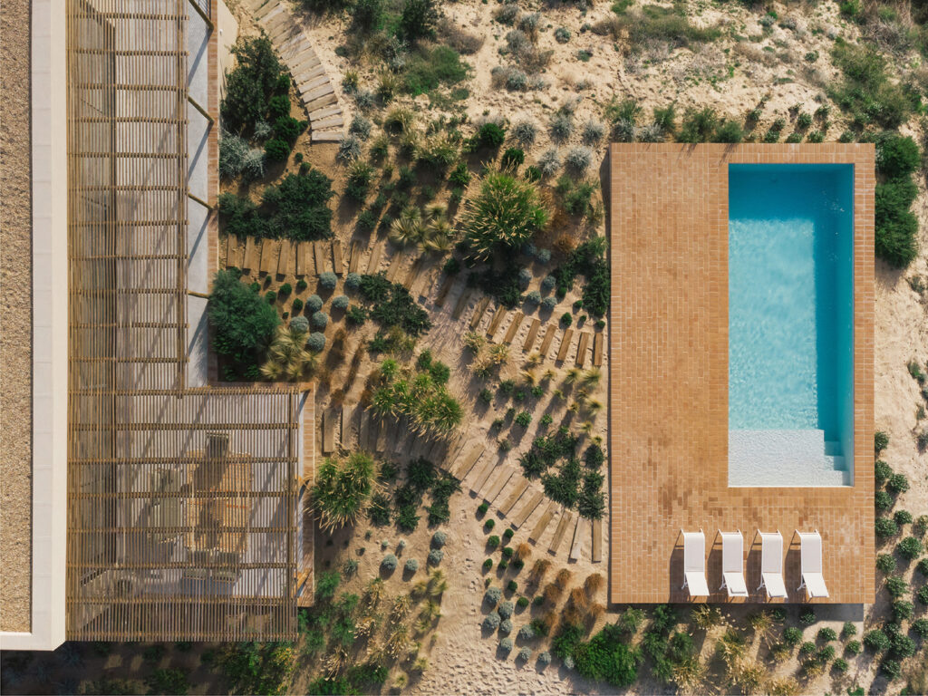 Brilliantly impactful both inside and out, Melides House from Fragmentos Architecture has a central and western wing that hosts five bedroom suites, two of which are independent and all with a strong relationship to the surrounding landscapes. The roof is projected to different lengths according to the solar orientation, extending the interior of the dwelling to exterior spaces covered by pergolas. Pathways which are made from wooden beams lead us to the swimming pool which, designed over a natural amphitheater, really makes the most of the sun’s exposure and invites us to reflect on the visual relationship between the space and the landscape.
