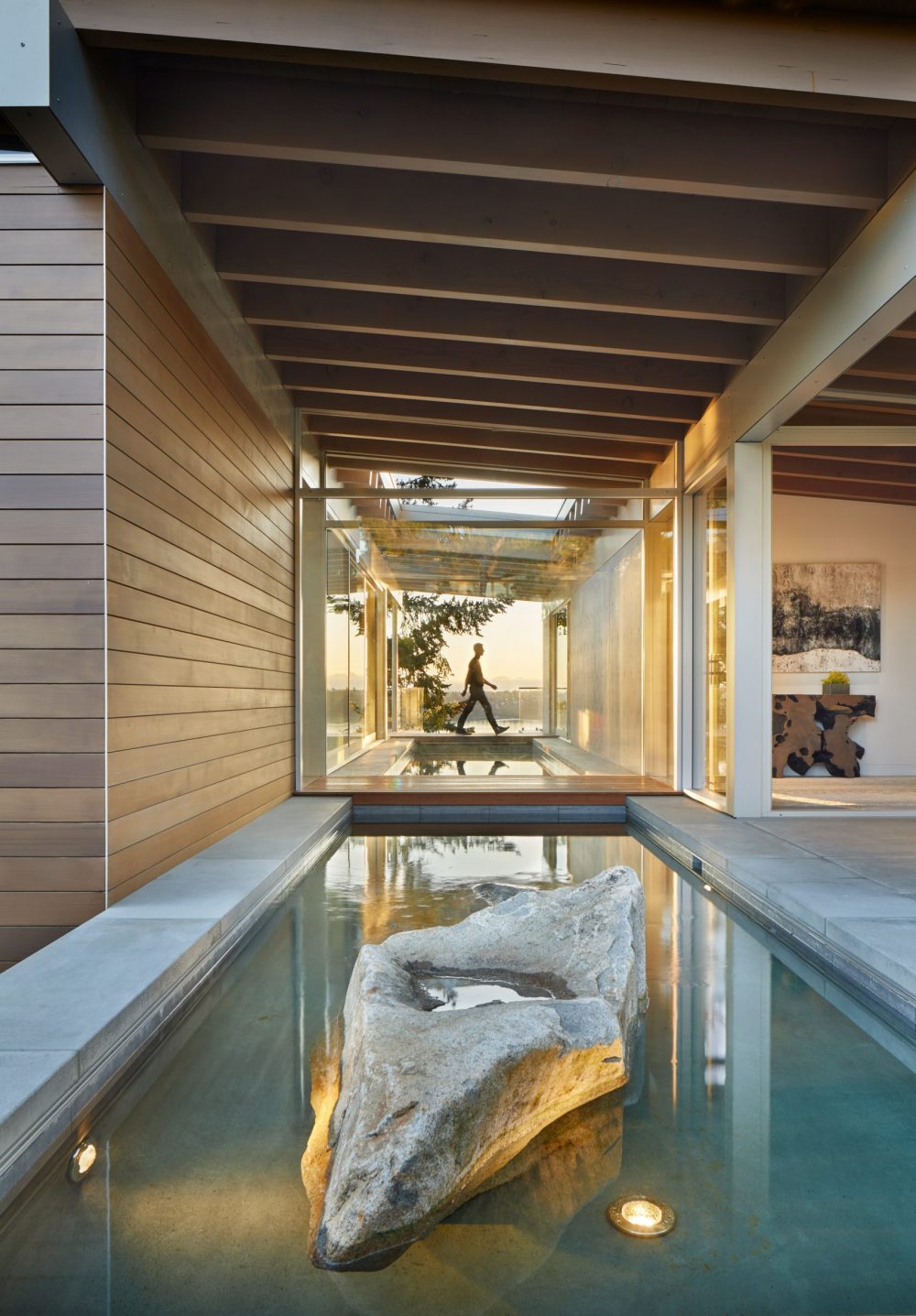 One of the most eye-catching features of the Mercer Island Residence is how it is traversed by a “spine” of water that divides the interior spaces and provides access to water to multiple different rooms in the home. There are two bridges, one covered and the other open to the elements, that span this divide and provide a compelling visual impact for anyone who visits the home for the first time. When driving up to the home, visitors pass by a reflective water feature that signals the entrance to the property.
