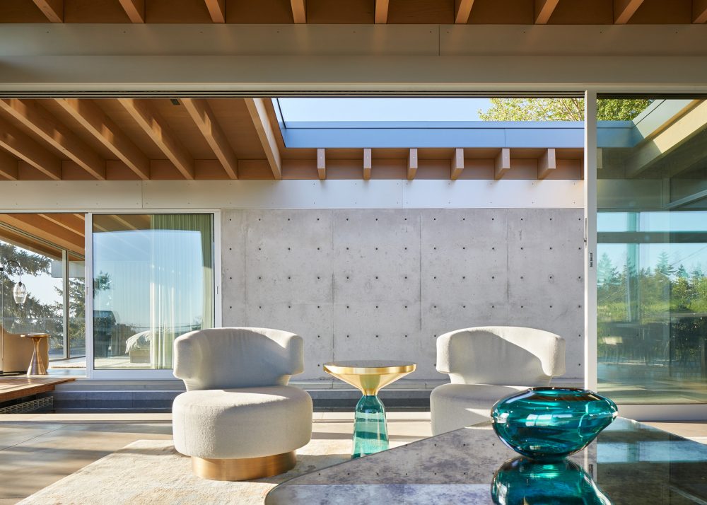 The experience of walking up to and over water, both inside and outside of the home, delivers a relaxing and tranquil feeling that one rarely experiences inside a residential building and it’s clear to see that Garret Cord Werner have done a magnificent job of hitting their brief of making water a focal point of this majestic, modern home on Lake Washington. It has an interior bridge which is enclosed by glass and leads from the foyer to the main living area, an open-concept kitchen, living and dining room with wraparound glass walls that deliver the amazing views out onto the lake.