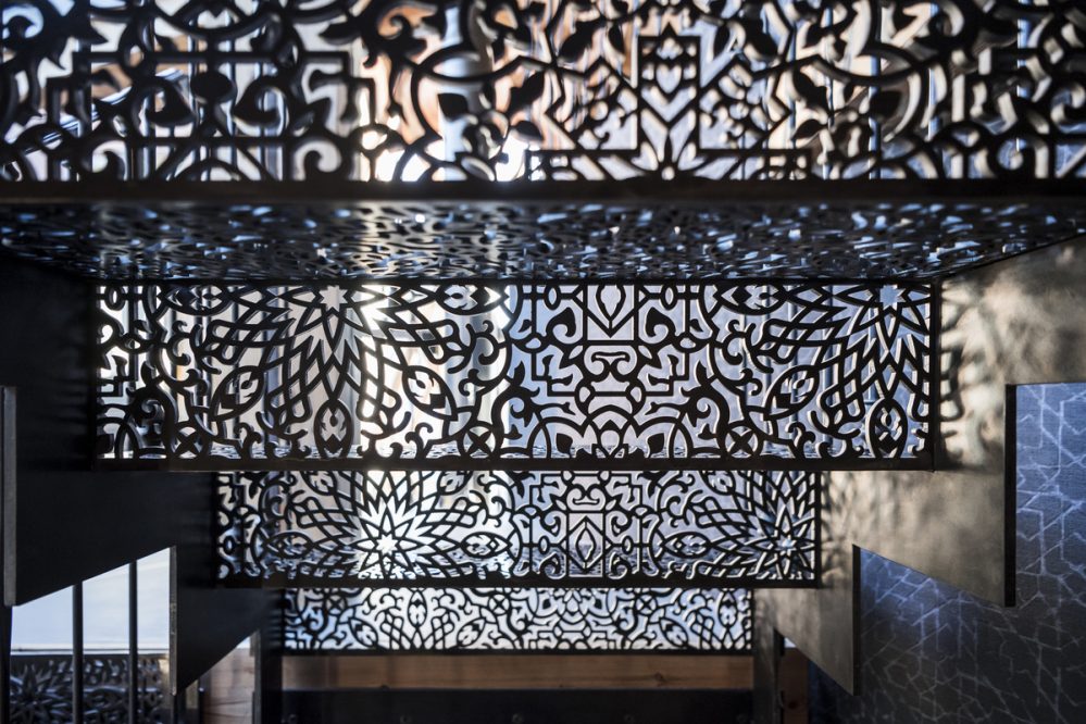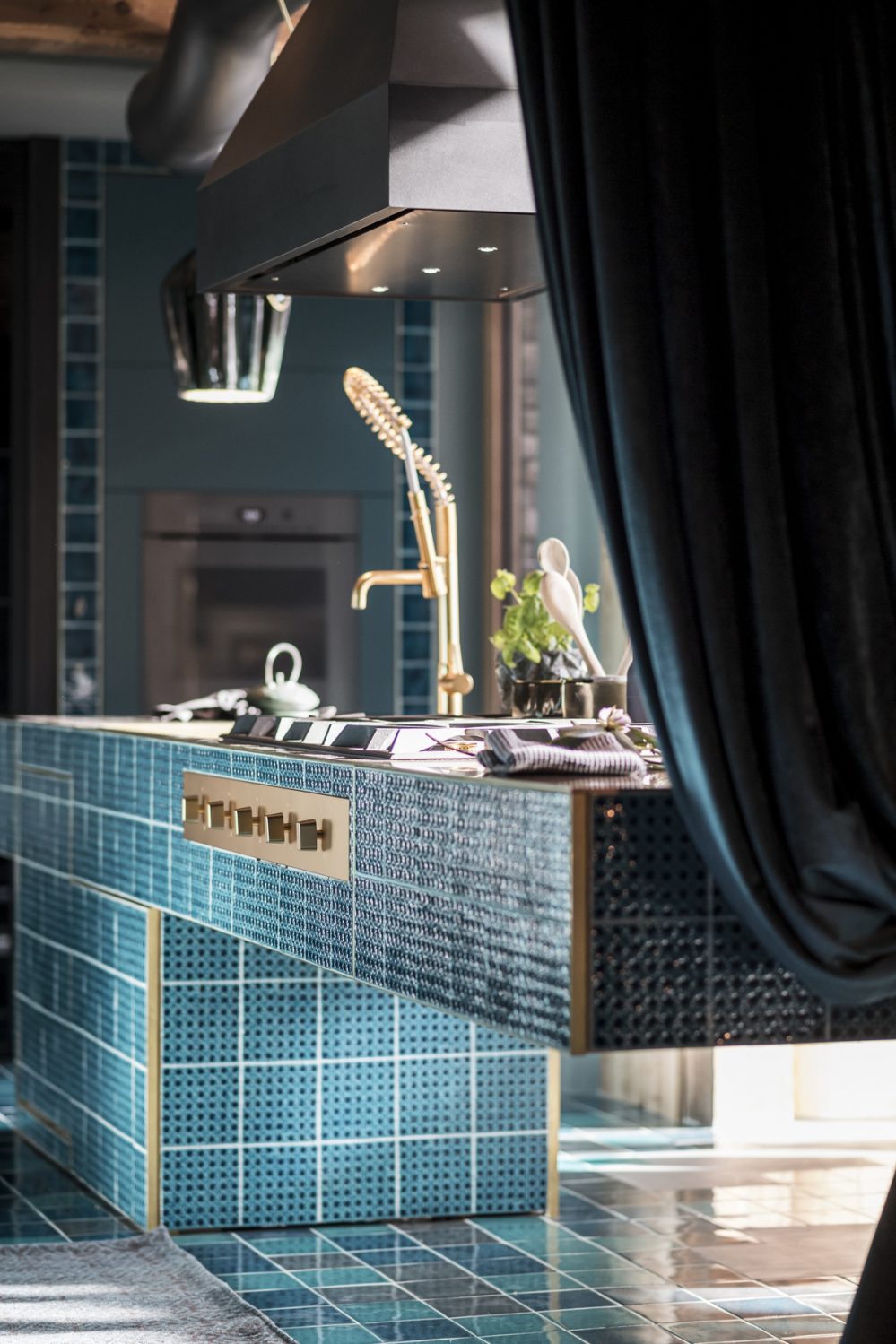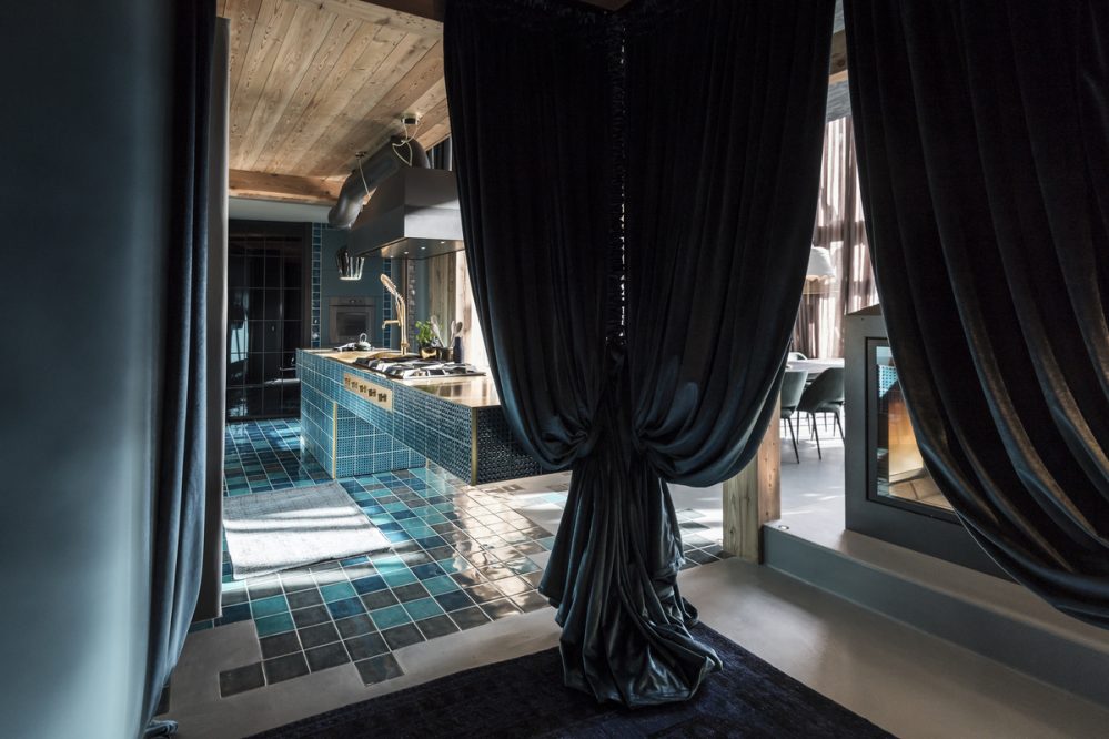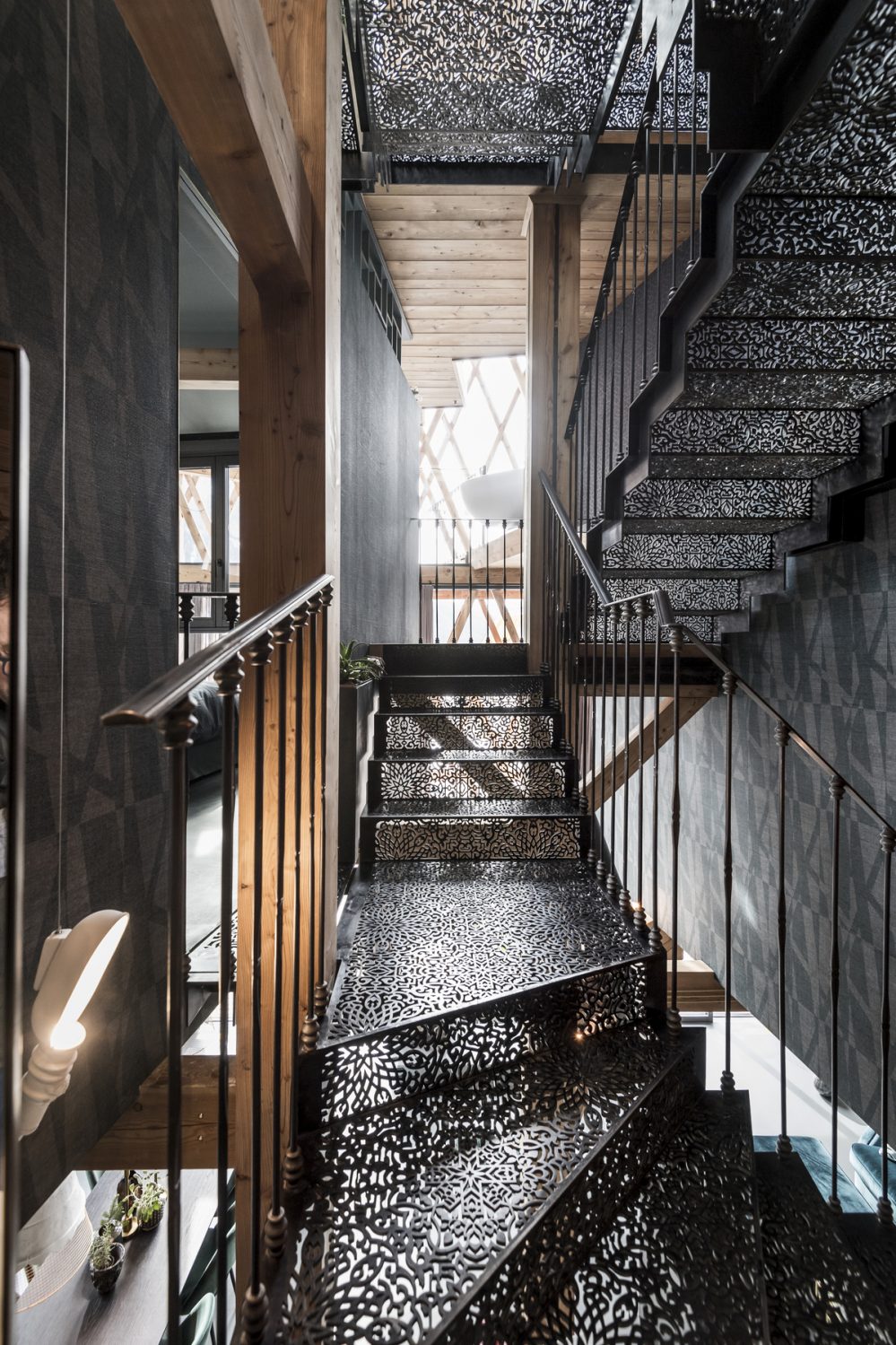 As you would expect from such an incredible build, the materials used throughout the construction have been carefully considered. As well as using materials with local tradition – namely, wood and stone – it also introduces others of a more contemporary nature. The floor resin, provides flow to the ground floor, and alternates between baked clay and sea-blue tiles, the same as used for the side covering of the kitchen’s work surface. The brass gives breathtaking warm tones to the furniture details and to the work surfaces. The staircase, in finely worked steel recalls the grates of Arabian tradition, creating a chiaroscuro effect which is extremely unusual for the Alpine environment. An out of this world piece of architecture.
