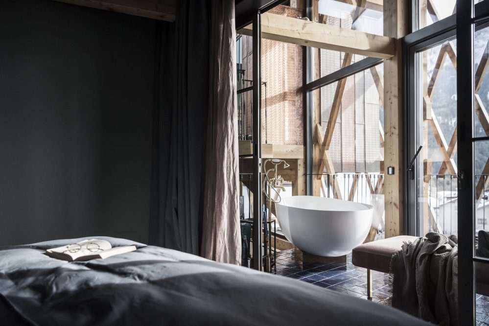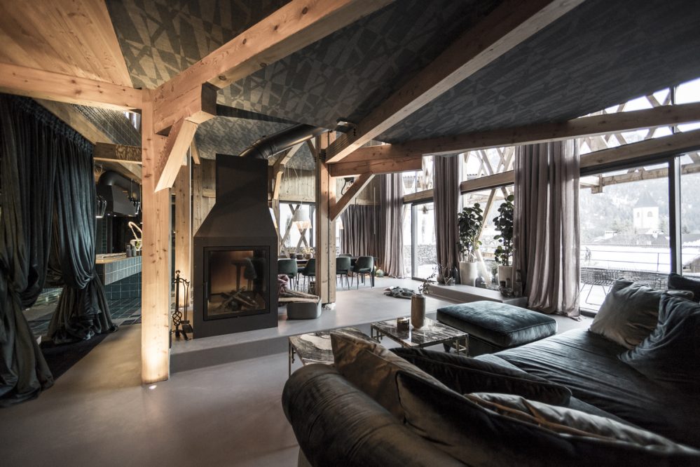 Everything about the design of the Messner House impresses but the interiors really are in a league of their own. The bedrooms are designed as micro-homes, with each one having its own unique design. One gains access via a staircase and a walkway system, which as well as having a connecting function, accommodates the bathroom areas with tubs and showers. On the top floor, a box plays host to the sauna with a panoramic view, which extends out of the southern front. Before reaching the sauna, there is a book-lounge with an antique majolica stove, which has been taken from the pre-existing building to give a touch of authenticity.