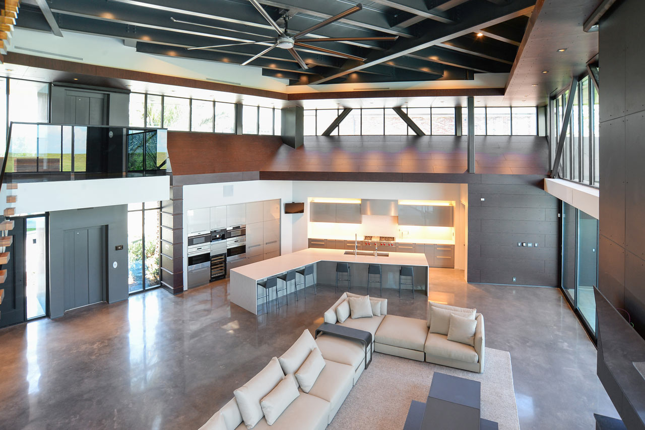 The Miller Lane Residence from M2 Studio has an earth berm levee which aims to deliver a barrier between the home and the lake, and makes sure that the main structure will remain unaffected during a hurricane. A main area of concern during the design process was to make sure the views from each proposed floor were maximised and in order to do that, the architects brought in a mechanical lift to scope it out.
