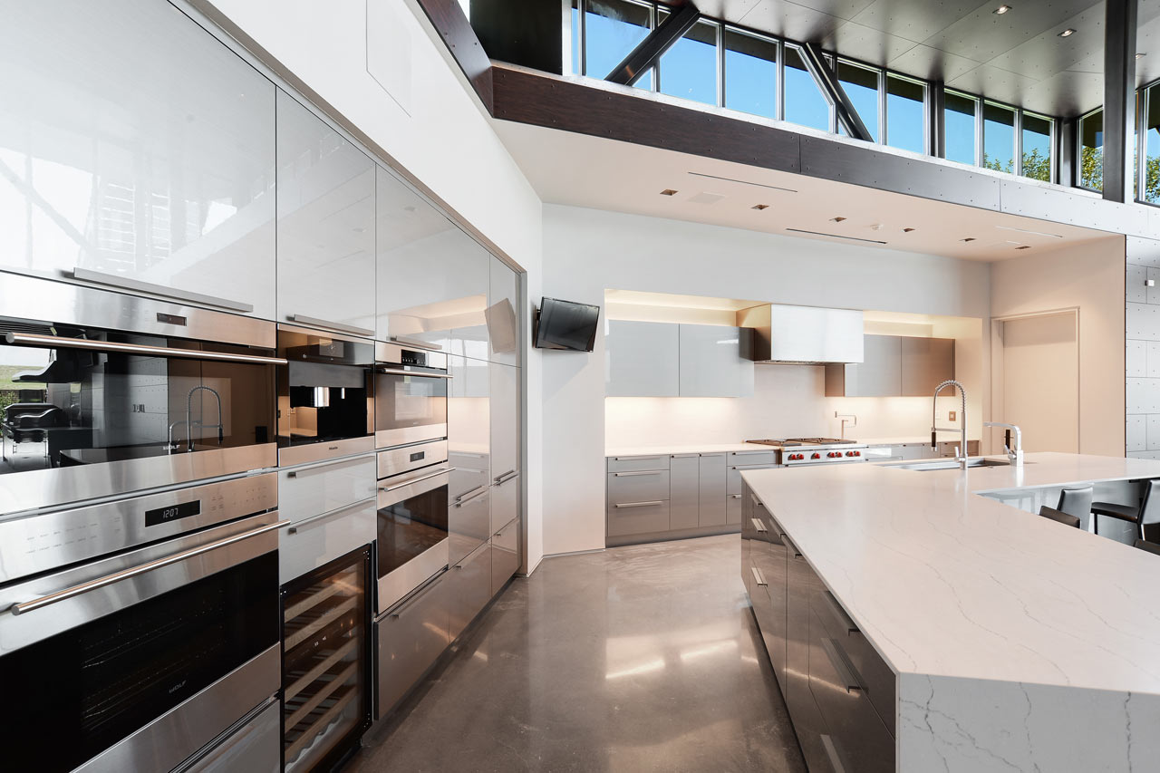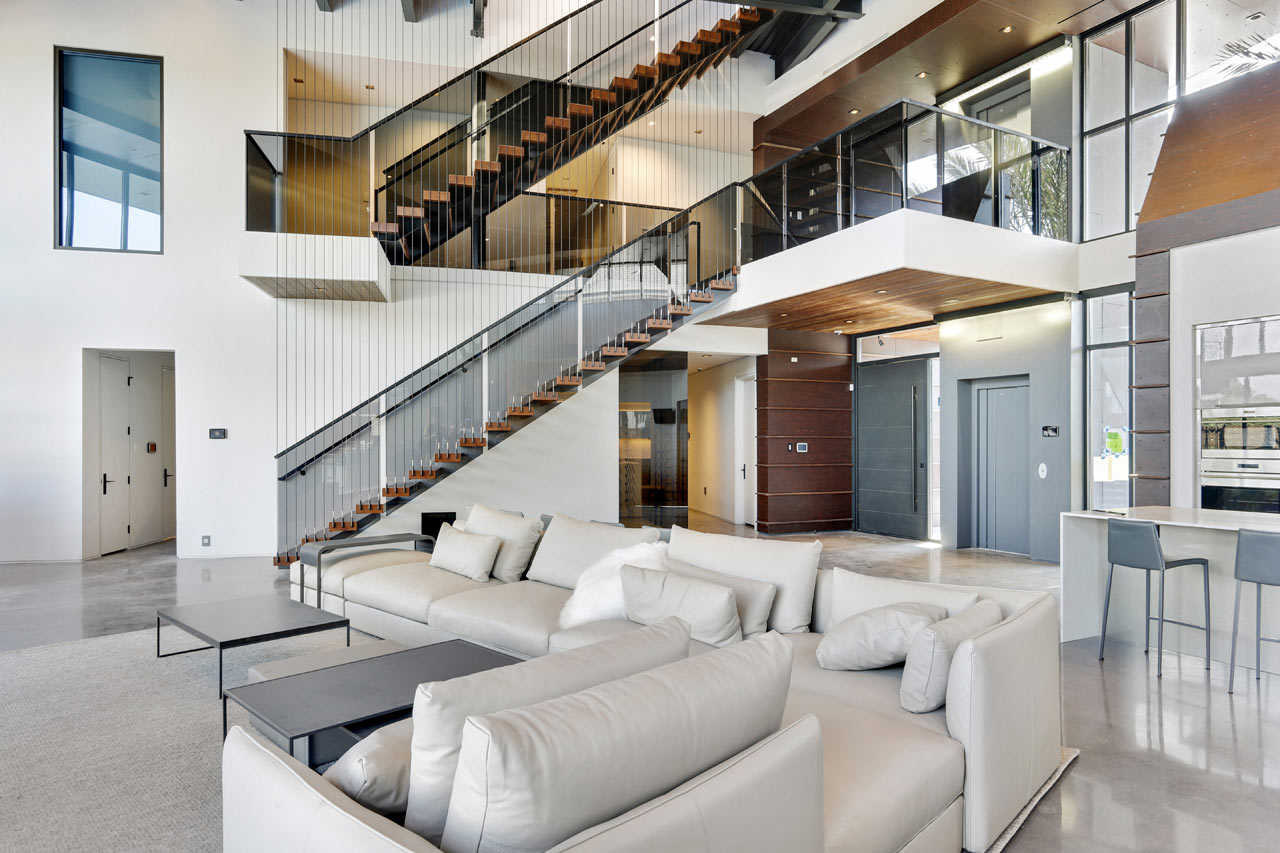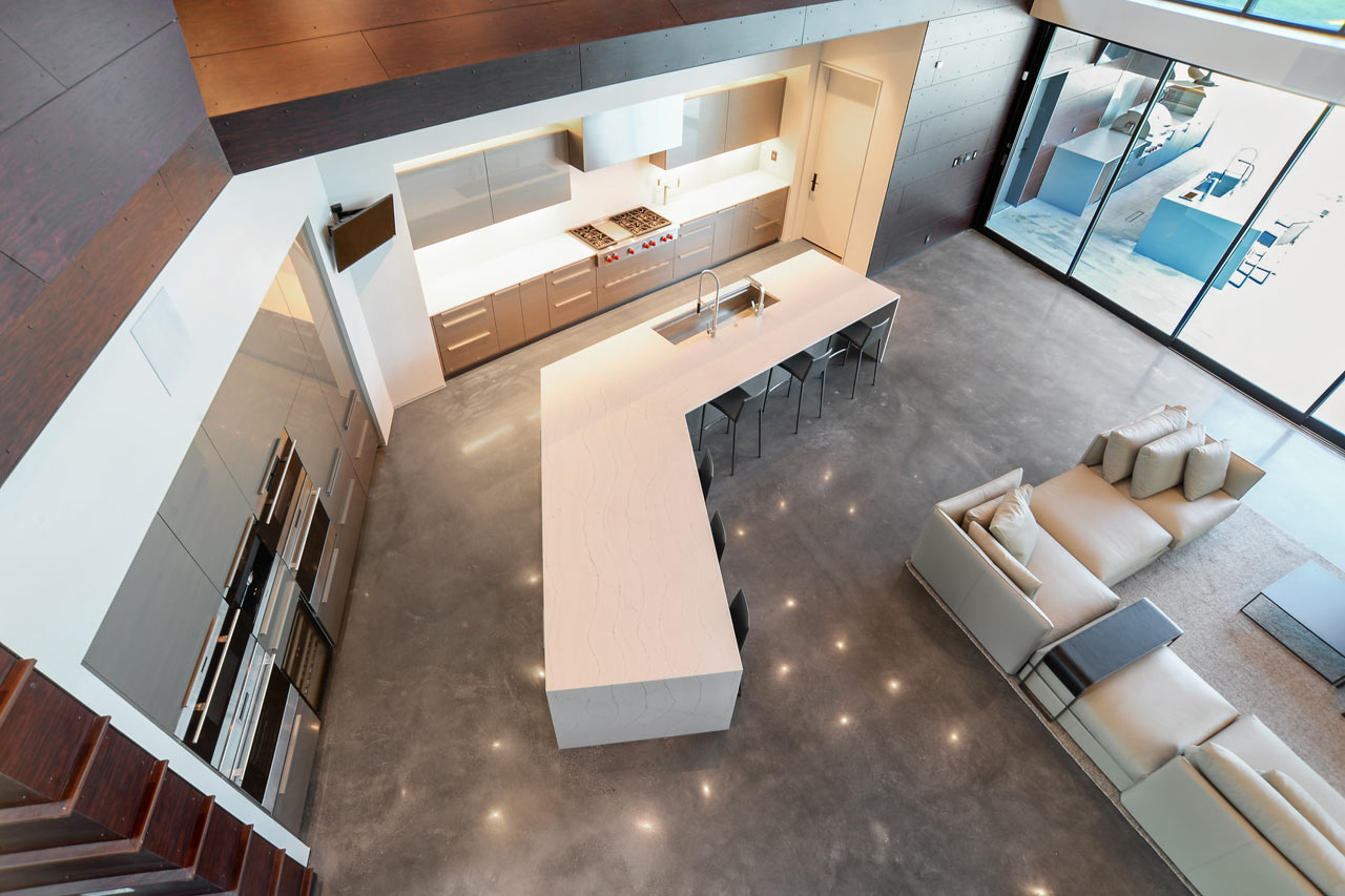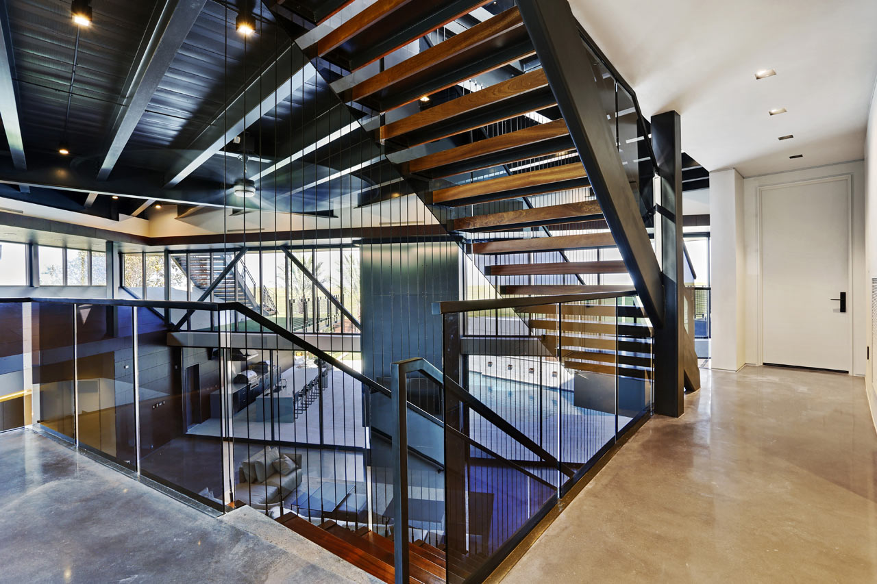 Exceptionally striking from a design point of view, the M2 Studio designed Miller Lane Residence has a cantilevered second floor which has views out over the living space below and also housing the private family spaces behind an expansive, curved wall. The staircase is a eye-catching feature of the property and it is open with walnut treads that get support from hidden floating steel plates and it is a real focal point of the living space of the Miller Lane Residence.
