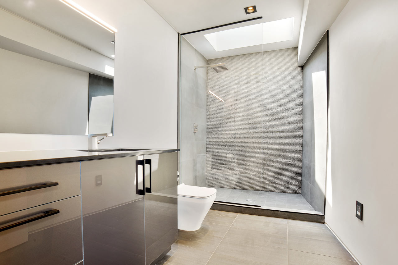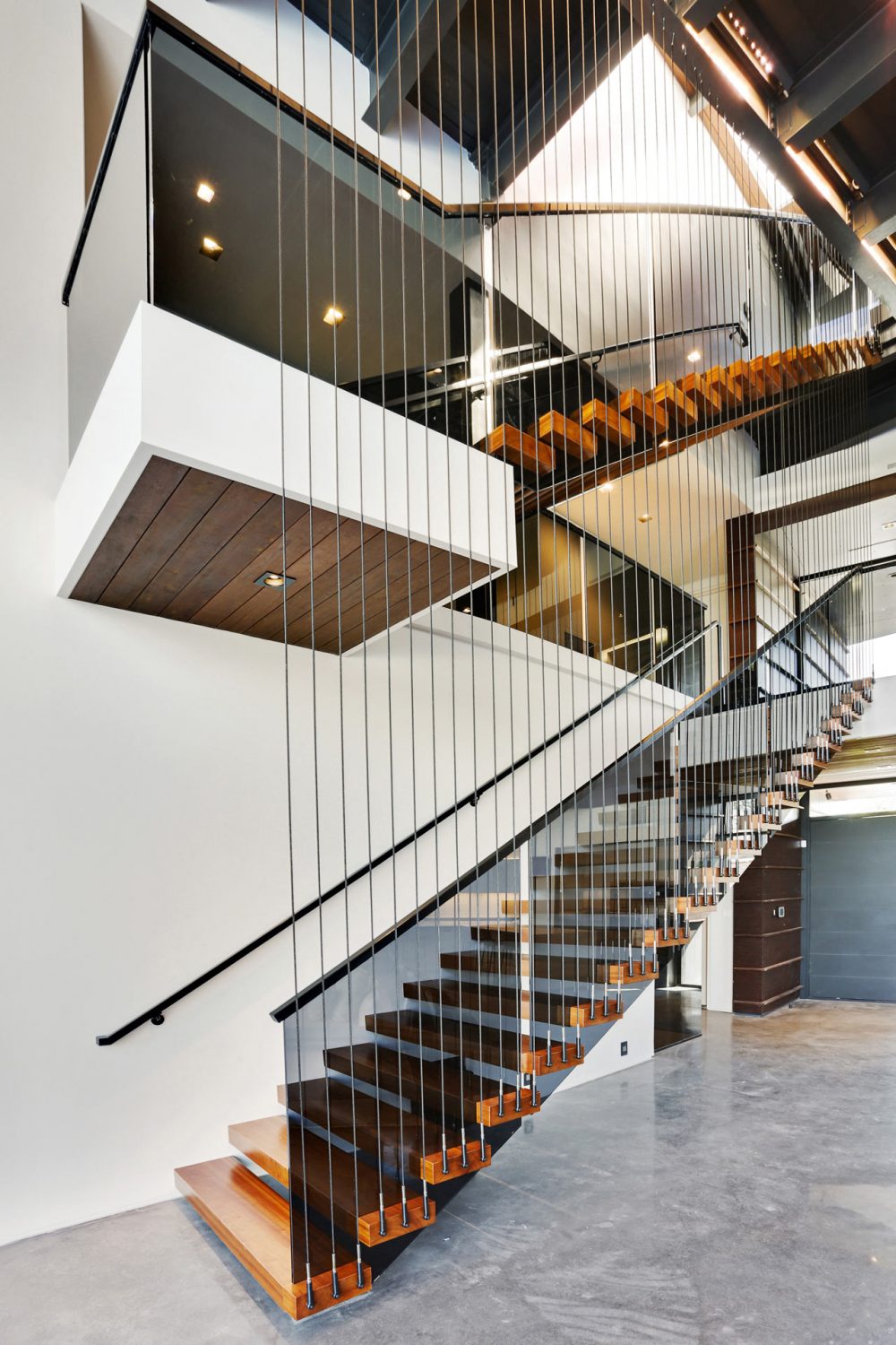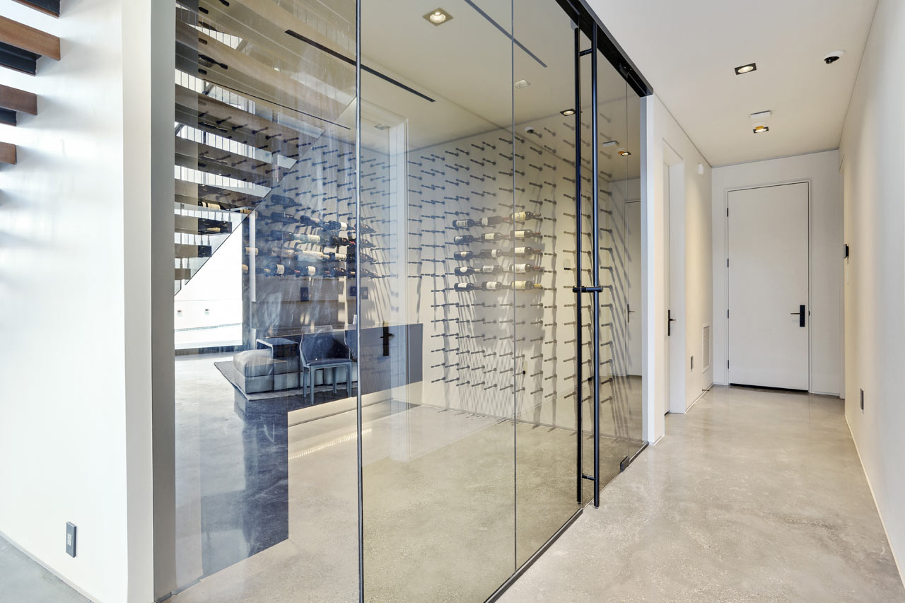 Exceptionally striking from a design point of view, the M2 Studio designed Miller Lane Residence has a cantilevered second floor which has views out over the living space below and also housing the private family spaces behind an expansive, curved wall. The staircase is a eye-catching feature of the property and it is open with walnut treads that get support from hidden floating steel plates and it is a real focal point of the living space of the Miller Lane Residence.