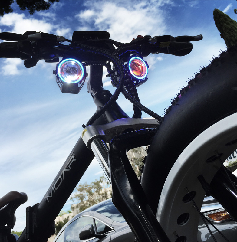 Given the 85 mile range of the MOAR Fat Tire Folding eBike, it is definitely one of the most versatile machines on the market and ideally suited for commuting or day to day use as you head to the shops, gym et al. With an abundance of safety features that set it apart, such as 1000 lumen LED projection headlamps to light up the road and angel eyes to illuminate the rider, the quality of the design and attention to detail throughout really is second to none.