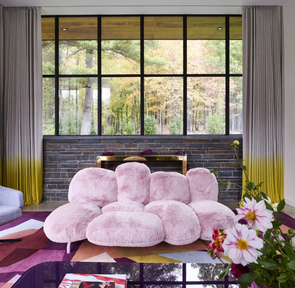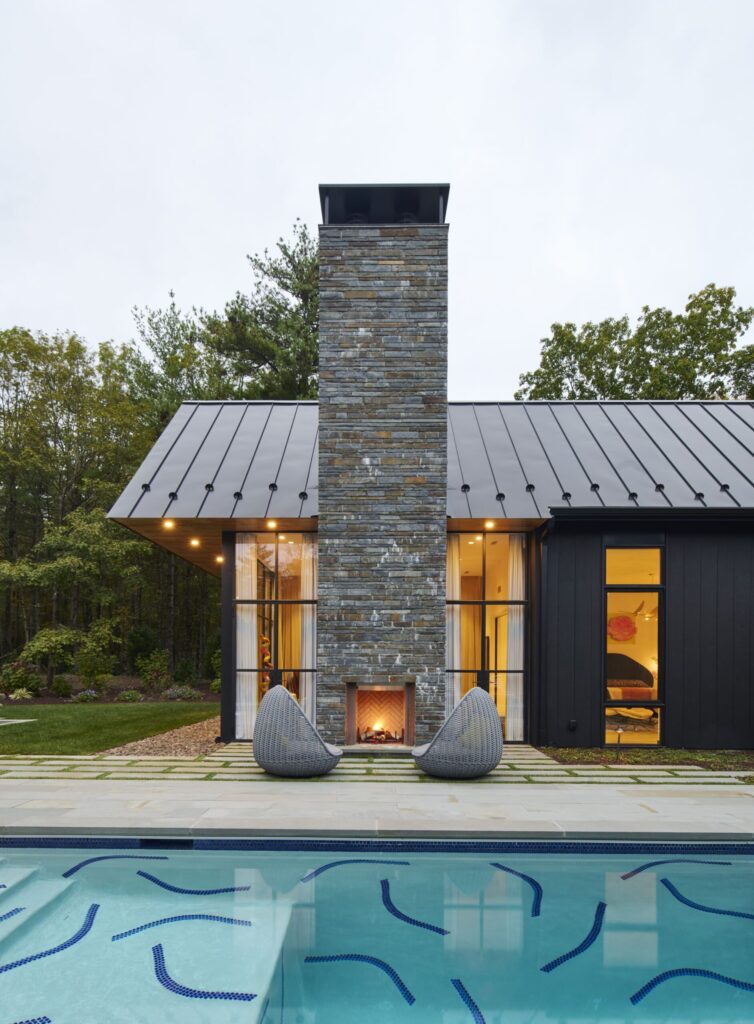 The custom-tiled pool, with its wading area and ample chaise lounges, explicitly references the iconic pools of David Hockney—a splash of artistic history in the middle of the woods. A pool house with a trellis roof covers a curved concrete table and a full outdoor kitchen, creating the ultimate setting for summer barbecues.