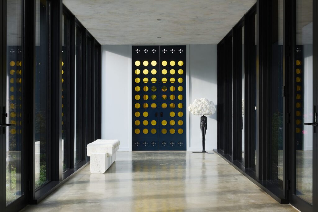 This transparent corridor does more than just move people from point A to point B; it serves as a visual bridge, balancing two private black barn structures while offering tantalizing glimpses into the central courtyard and pool area.